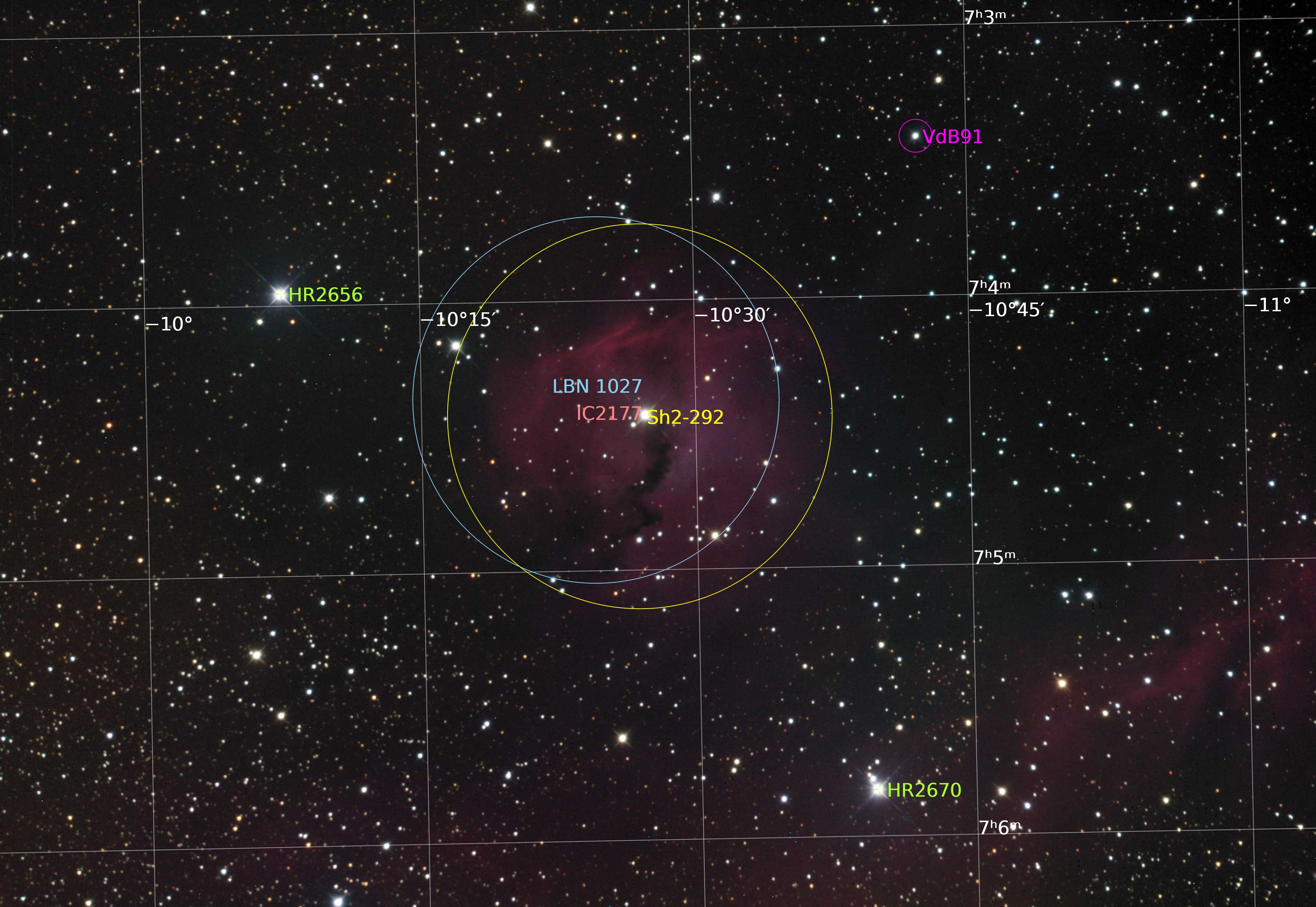 Close up of the head of the Seagull Nebula IC2177 also known as Gum 1 and RCW 1. Acquired over 2 nights. Distance is 3750 light-years. Pixel scale 1.14 arcsec/pixel. Field size 71.77 x 49.44 arcminutes.