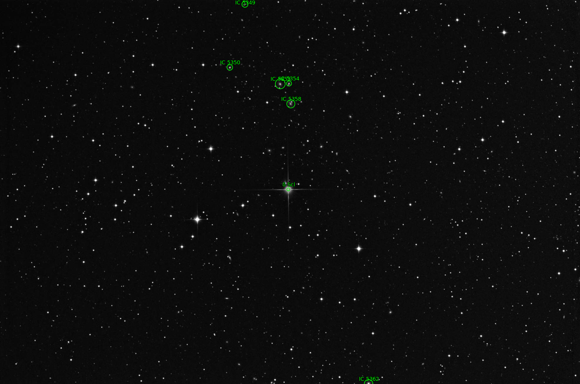 Delta Sculptoris (Mag. +4.59) can be seen in the center of this image. Although its a triple star system, the closest star, Delta Sculptoris B is not visible in this image. However Delta Sculptoris C is clearly visible at the 11 Oclock position with a separation of 74 arcseconds and magnitude of +9.4. Many galaxies are visible in the background including IC5358, IC5353, IC5354, IC5350, IC5349, IC5362 and countless others.