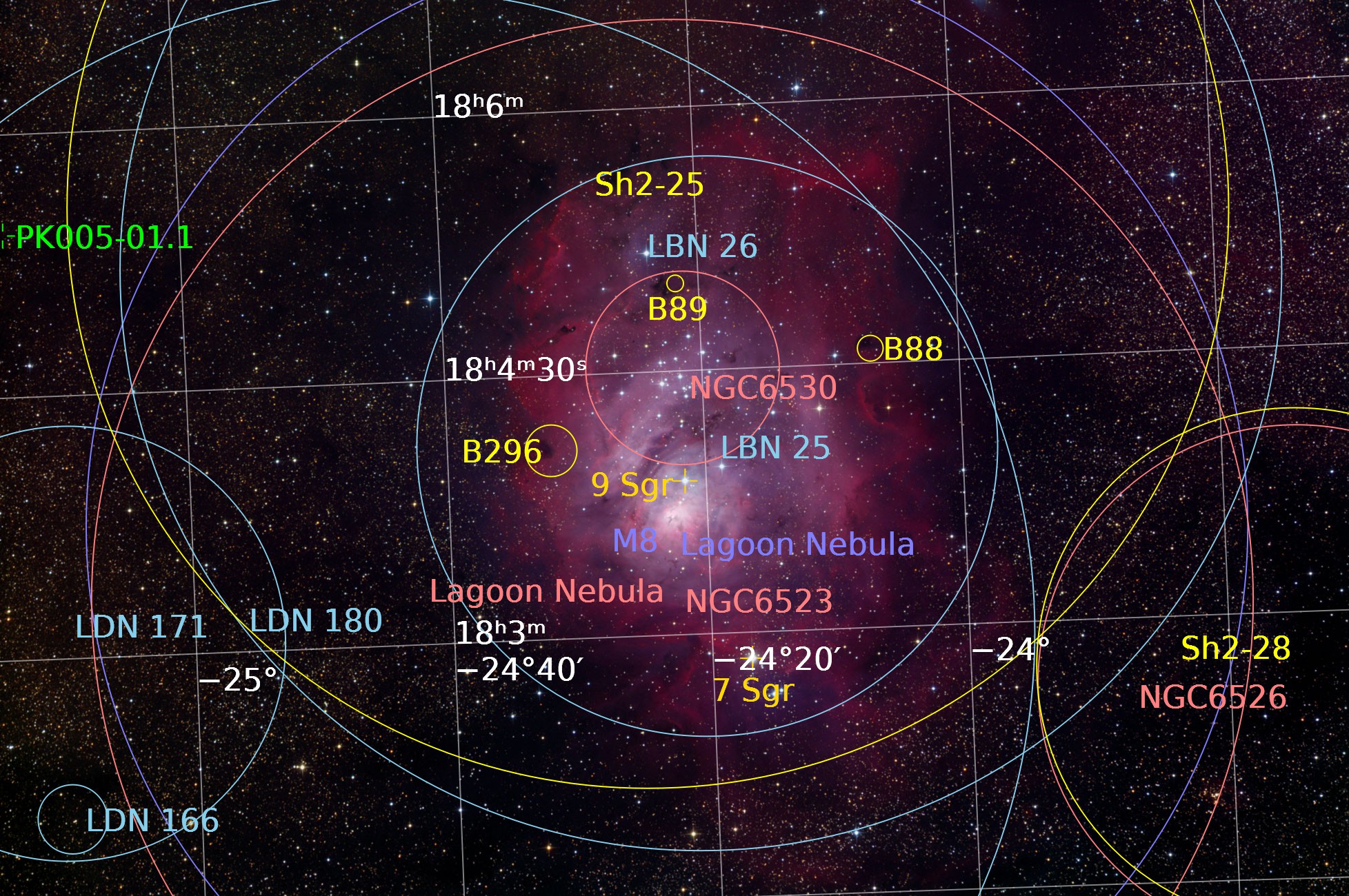 NGC6523 or the Lagoon Nebula is a giant interstellar cloud in the constellation Sagittarius about 4,100 light-years away. Size: 1.74 x 1.16 deg, Pixel scale: 3.21 arcsec/pixel