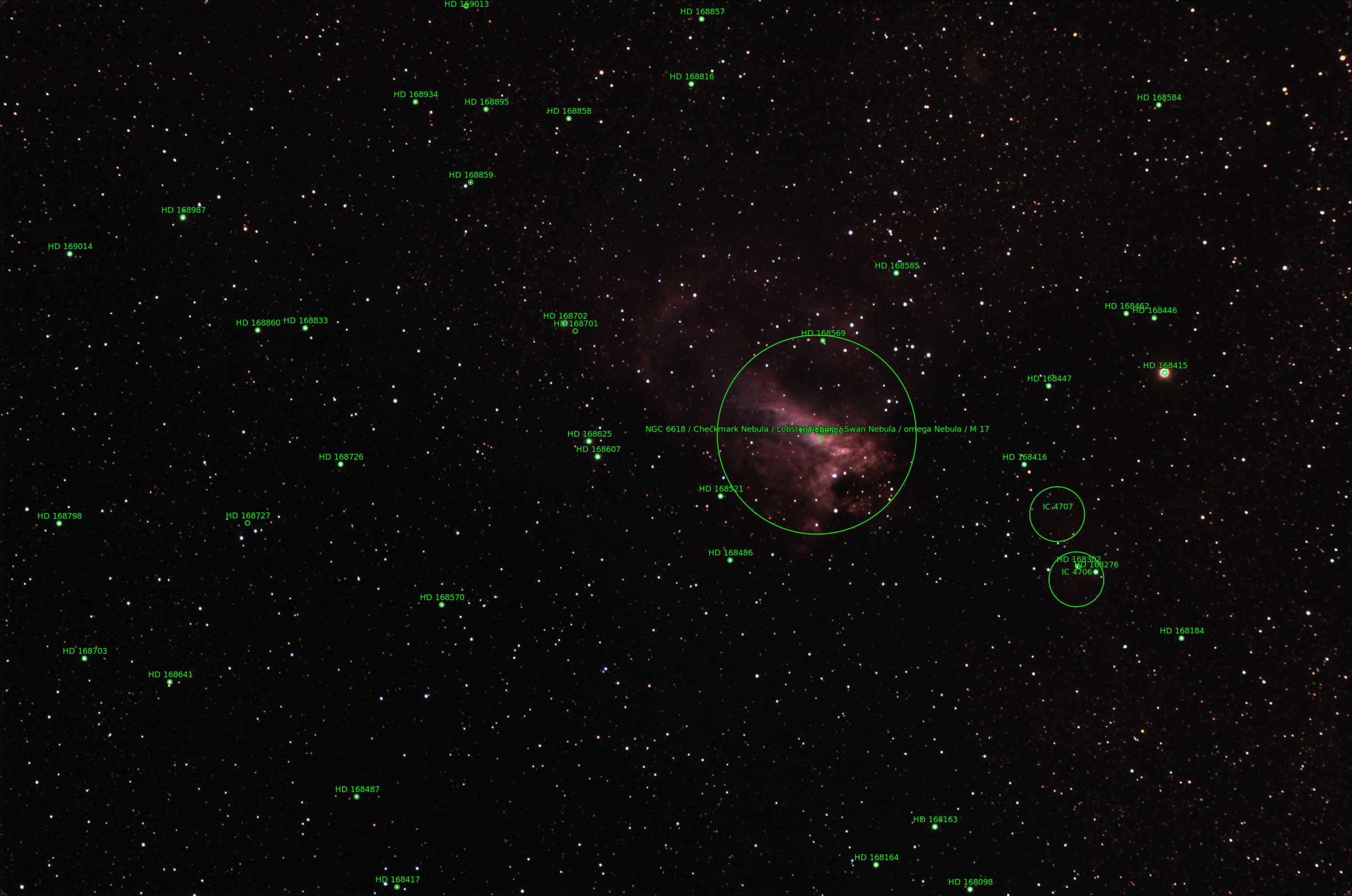 NGC6618 Messier 17 or the Omega Nebula is an H II region in the constellation Sagittarius about 5,000-6,000 light-years from Earth. This image was taken on the first clear night after a long spell of poor weather.