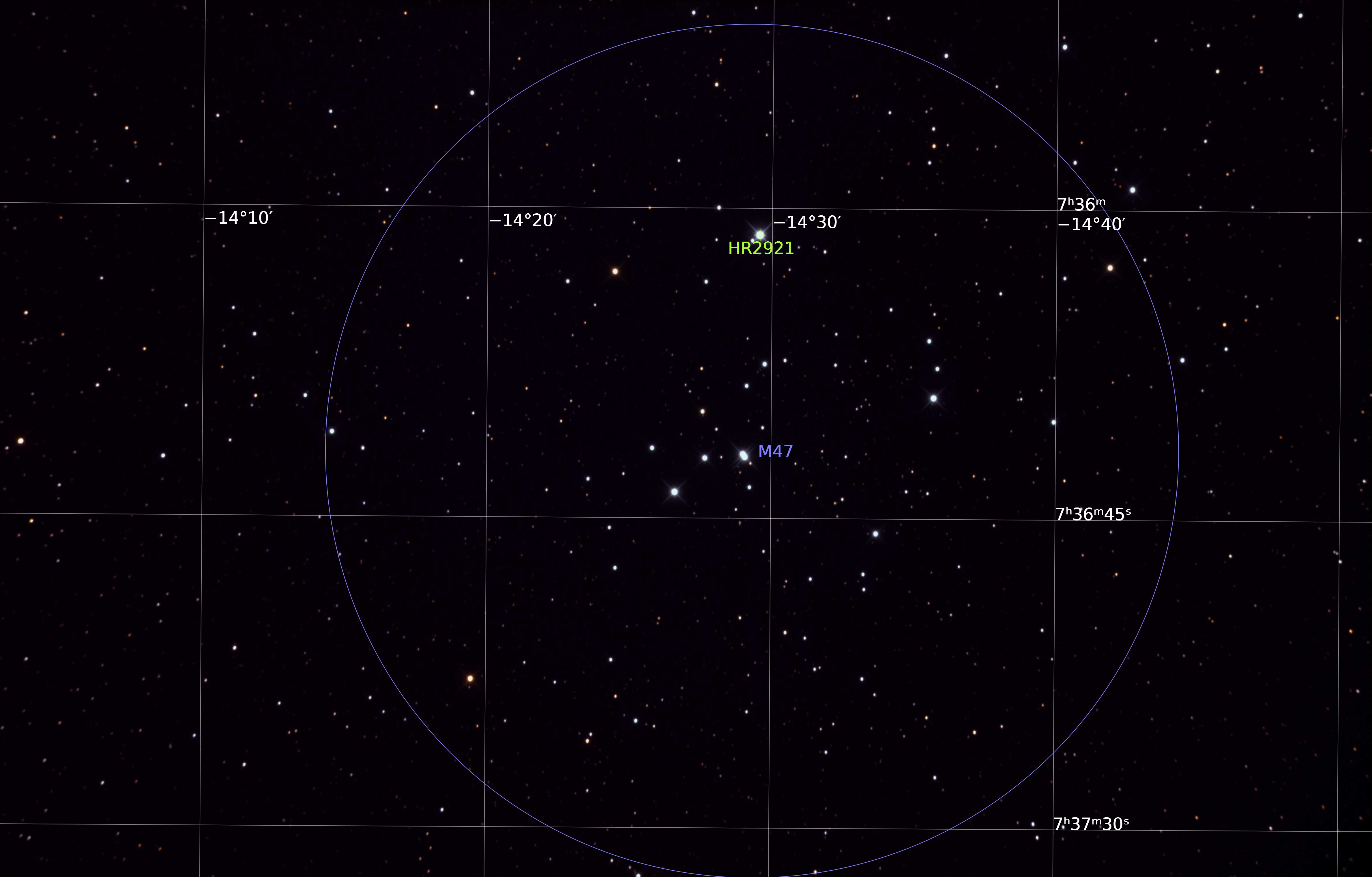 M47 or NGC 2422 is an open cluster of about 50 stars in the constellation Puppis. M47 is at a distance of about 1,600 light-years from Earth.