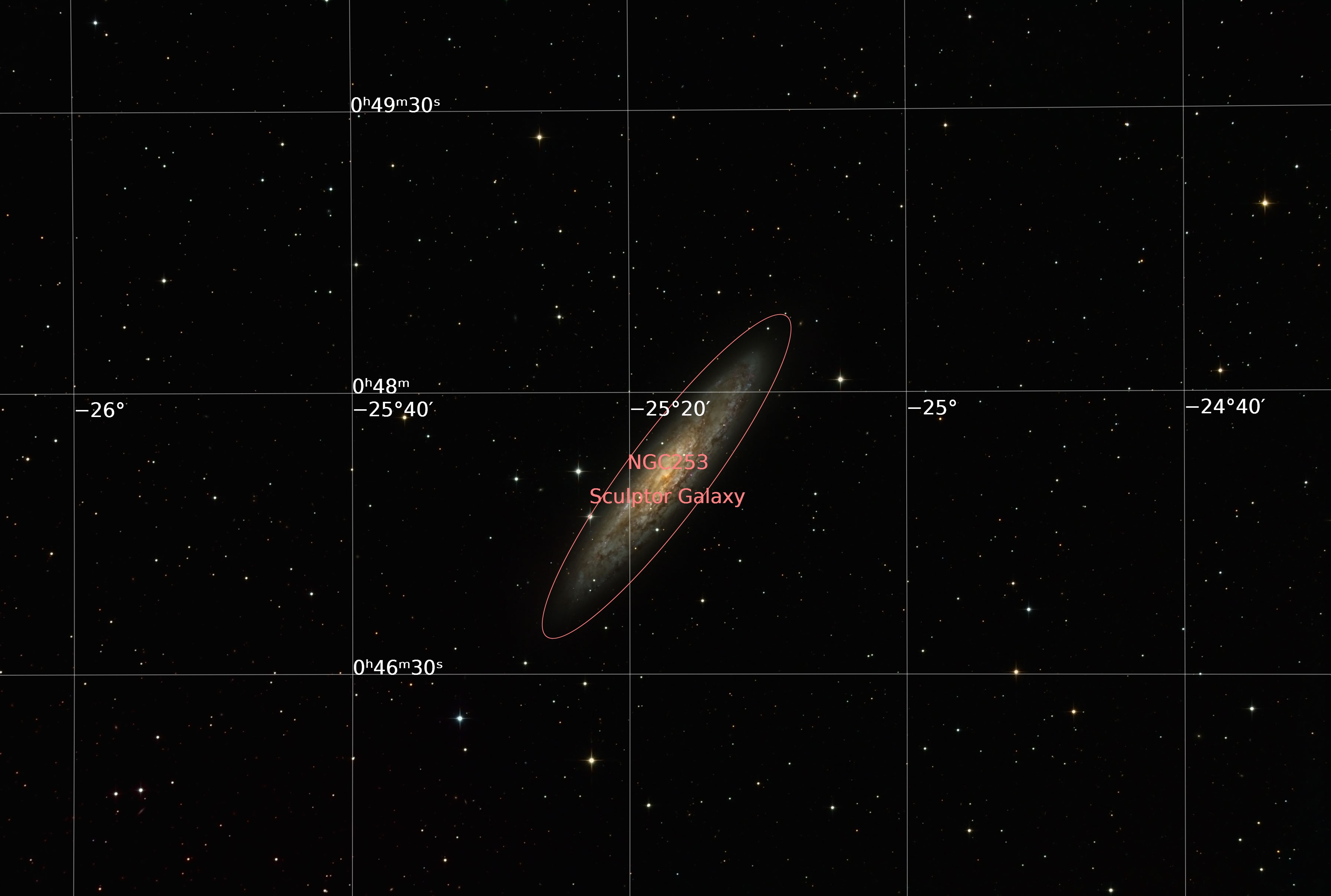 The Sculptor Galaxy (NGC 253) is an intermediate spiral galaxy in the constellation Sculptor. It is located about 11.4 million light years from Earth.