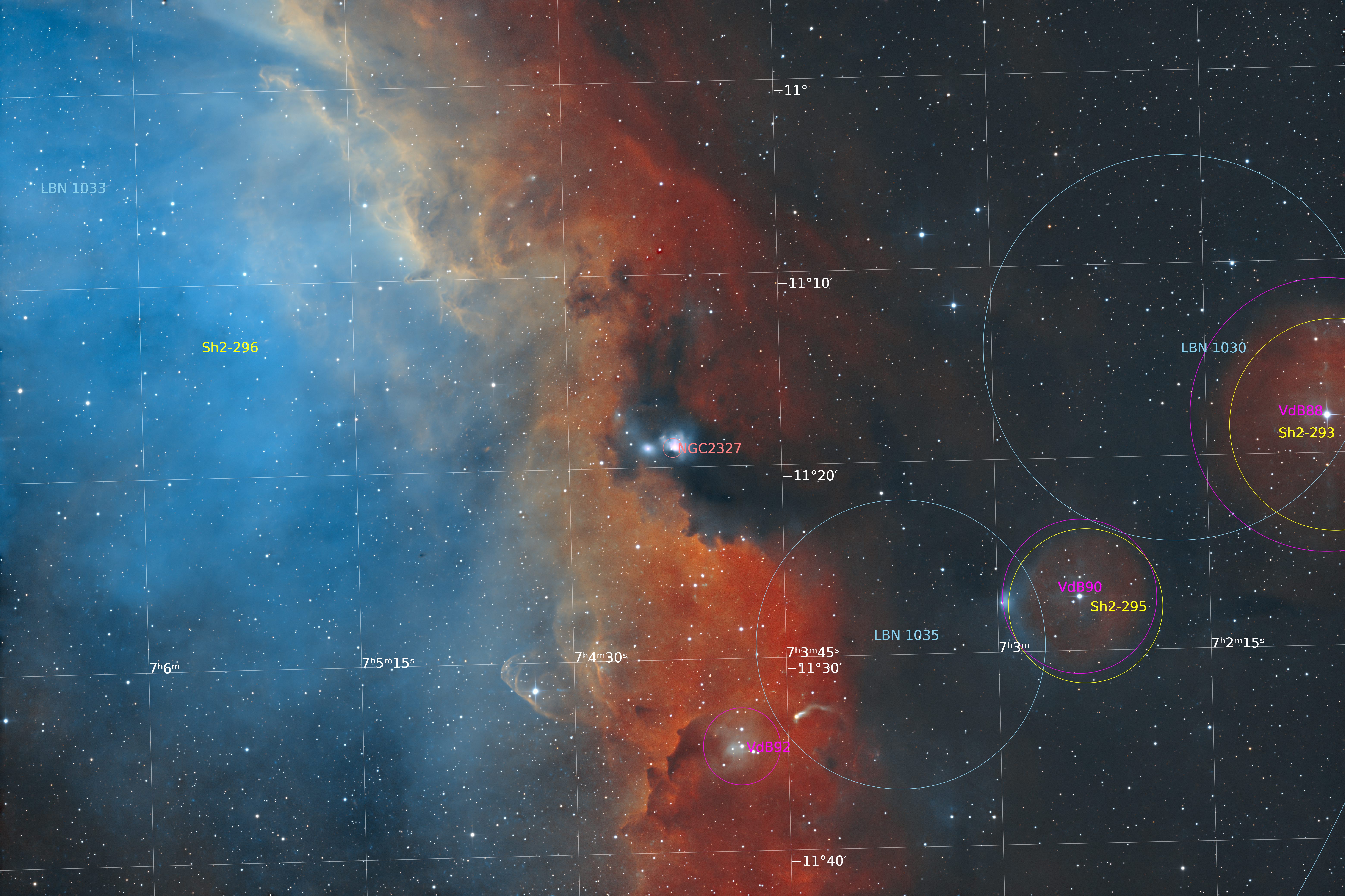 NGC 2327 is a Reflection Nebula in the Canis Major and is a component of the larger Seagull Nebula. Processed as Foraxx.