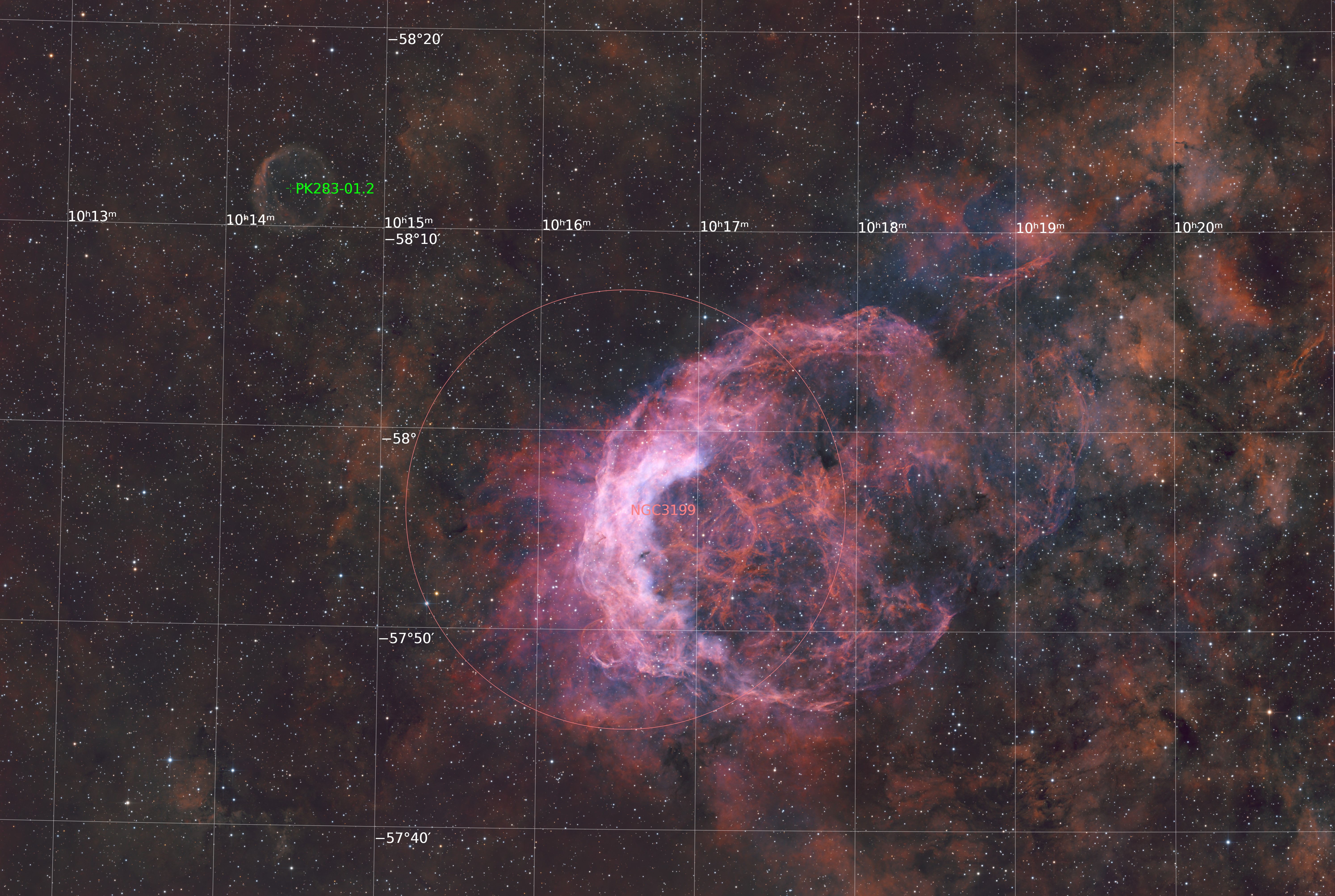 NGC 3199 (also known as GUM 28, RCW 48) is an emission nebula in the constellation Carina. It is commonly known as the Banana Nebula. The object was discovered in 1826 by the Scottish astronomer James Dunlop. In the top left you can also see a bubble planetary nebula (PK283-01.2 aka MeWe 1-2). 18 hour image taken over 5 nights.