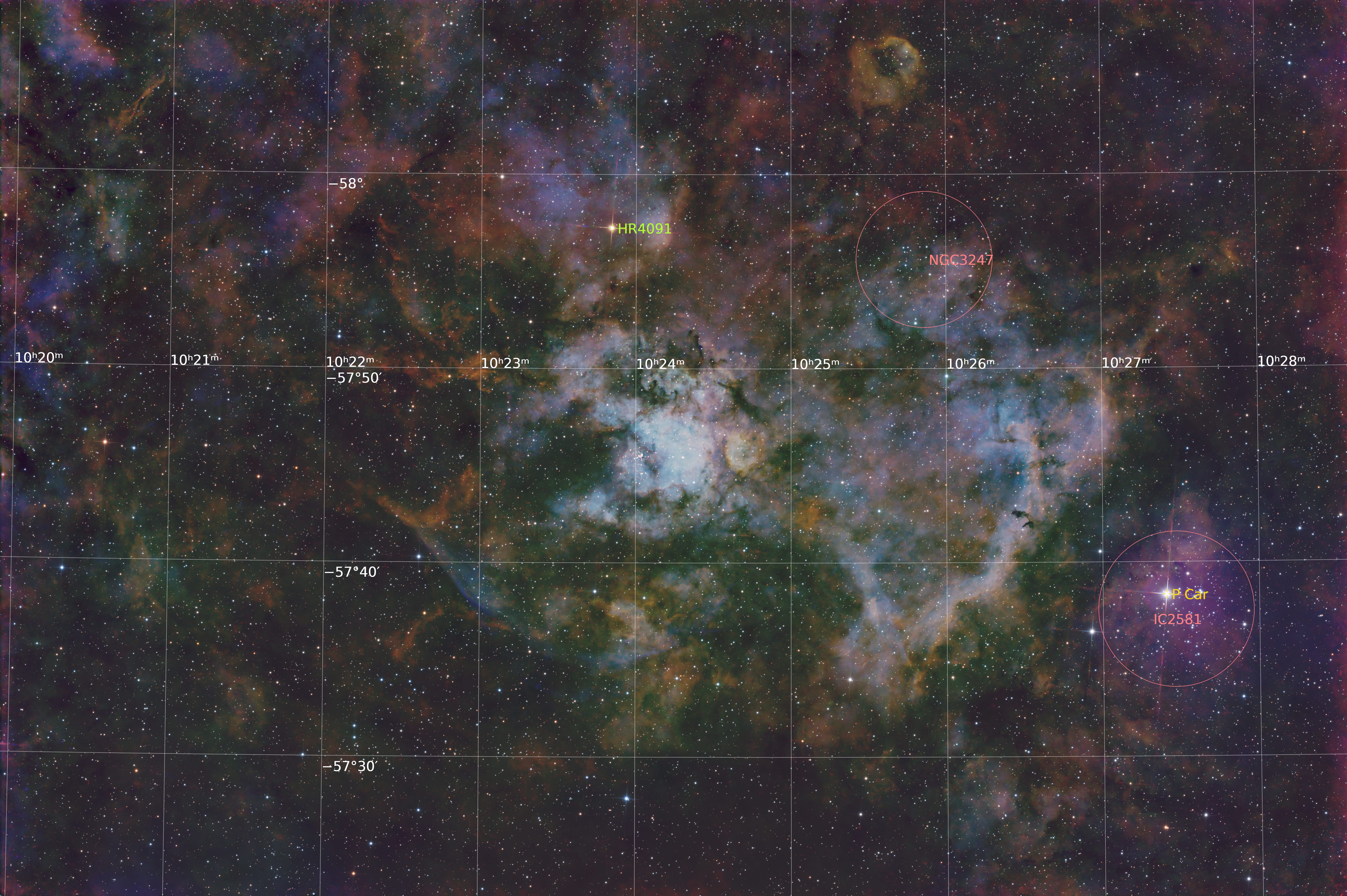 NGC 3247 also known as RCW 49, is a H II region nebula located 13,700 light years away. Commonly known as the Whirling Dervish Nebula. The bright star in this image is HD 90772 or V399 Carinae which is 206 times bigger than the sun and is 7000 ly away.