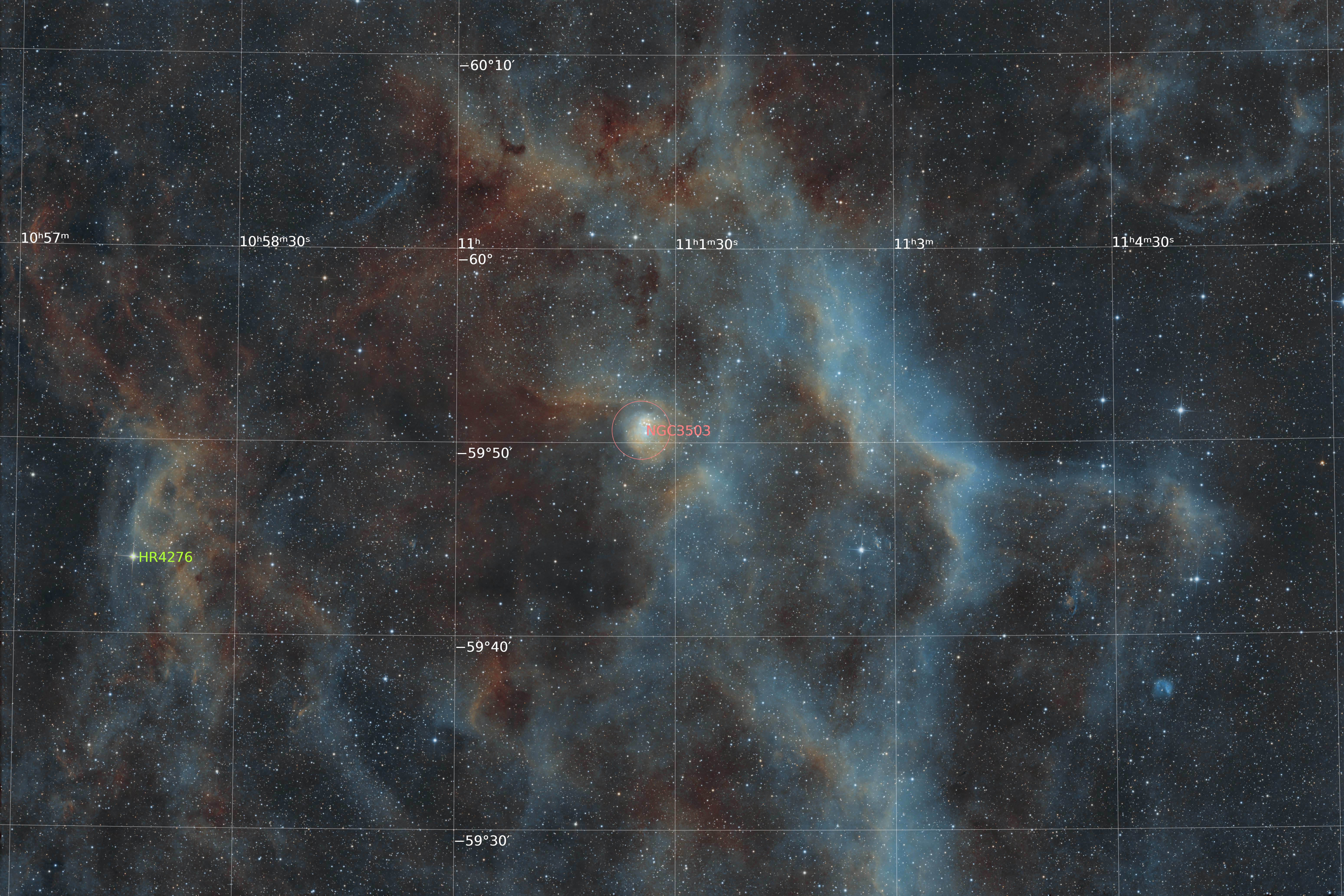 NGC 3503 is a small reflection and can been seen as the bright area right in the center of this image. The wide field nebulosity is part of RCW 54. The area imaged is located about midway between Eta Carina NGC 3372 (to the right) and the Statue of Liberty Nebula NGC 3576 (to the lower left). Interestingly it lies almost exactly on the galactic equator. Gum 34a and Gum 34b are also in the field of this image.