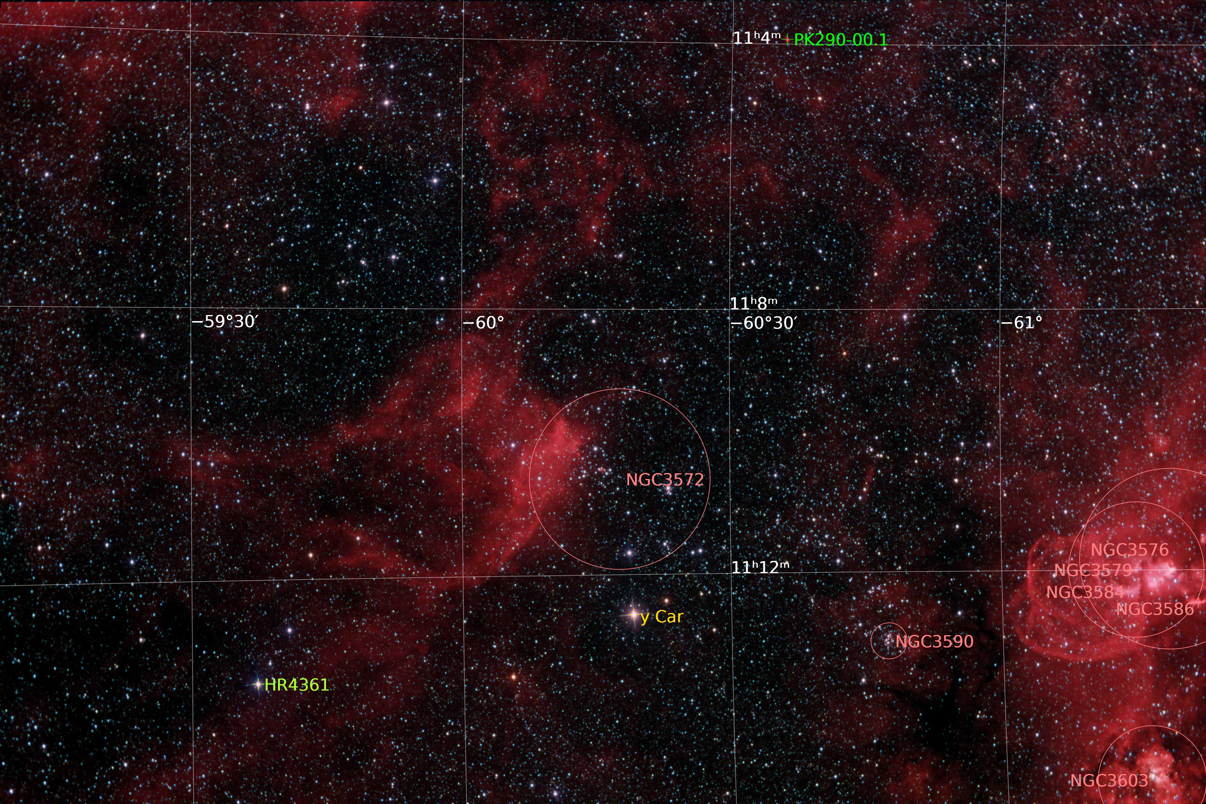 Located in Carina between Crux and Eta Carina Nebula, NGC3572 can be seen just left of centre in this image. Dark nebulas HMSTG348 and HMSTG345 can be seen at the lower right as well as RCW57e, NGC3603, RCW57w (containing NGC3584, NGC3579 NGC3582, NGC3581, NGC3586, NGC3576, vdBH47a and vdBH47c). Finally Planetary Nebula. Hf48 (PNG290.1-00.4) can be seen as a red smudge at the top of the image just right of centre. North is to the left. Taken over 2 nights remotely from Hong Kong.