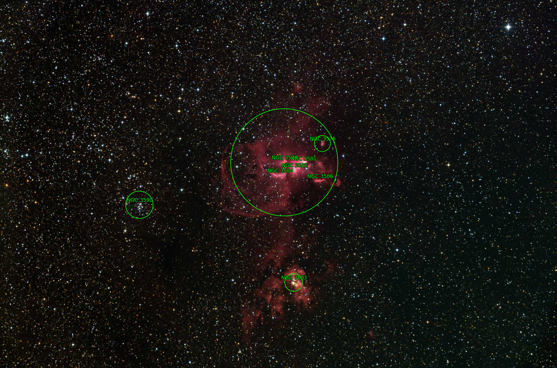 Located at the top of this image, NGC 3576 is an Emission nebula about 9,000 light-years away in the constellation of Carina. The open cluster NGC 3603 which can be seen in the lower half of the image is much further away at 20,000 light-years. NGC 3603 is a starburst region where extremely rapid star formation takes place. Size: 1.73 x 1.14 deg, Pixel scale: 3.2 arcsec/pixel
