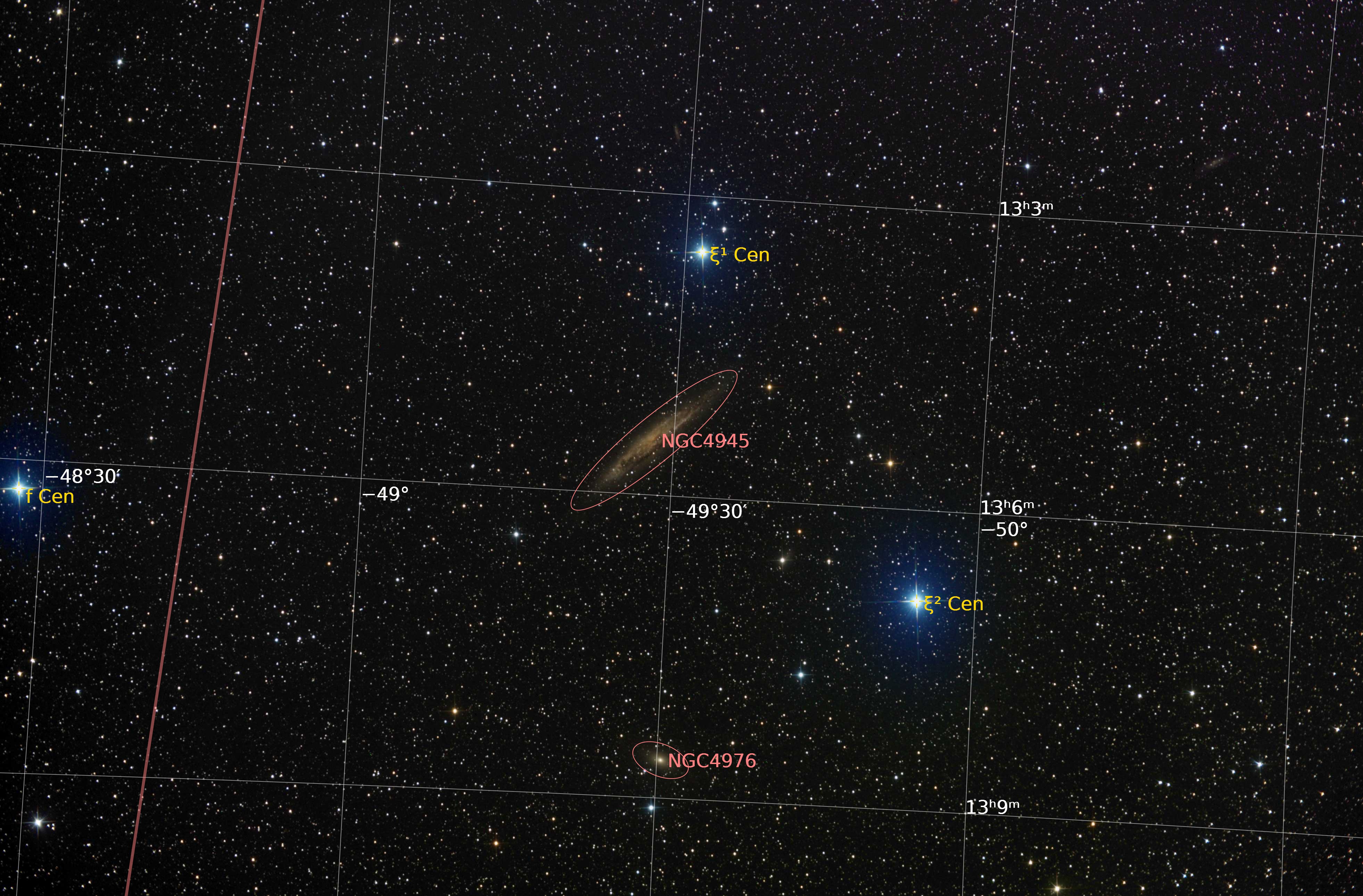 NGC 4945 is a dusty, edge-on spiral galaxy in the constellation Centaurus. Distance is approx 11.7 million light years. Other galaxies that can been seen are NGC 4976 (35 million LY) and NGC 4945A. Taken on a night with heavy dew and a light fog. Size: 2.18 x 1.43 deg, Pixel scale: 2 arcsec/pixel
