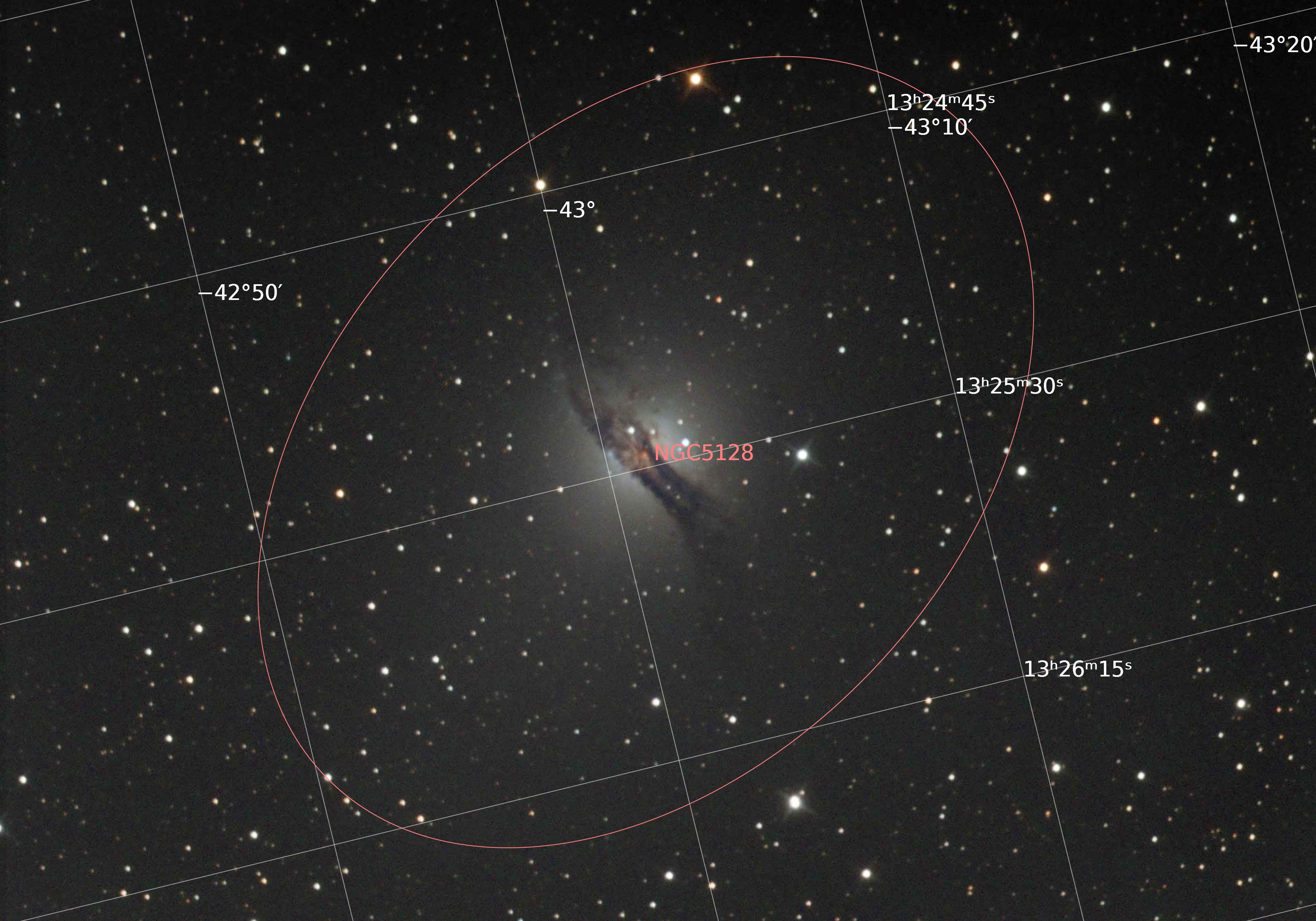 Centaurus A is a galaxy about 14 million light-years away in the constellation Centaurus. Size: 37.1 x 25.9 arcmin, Pixel scale: 0.699 arcsec/pixel