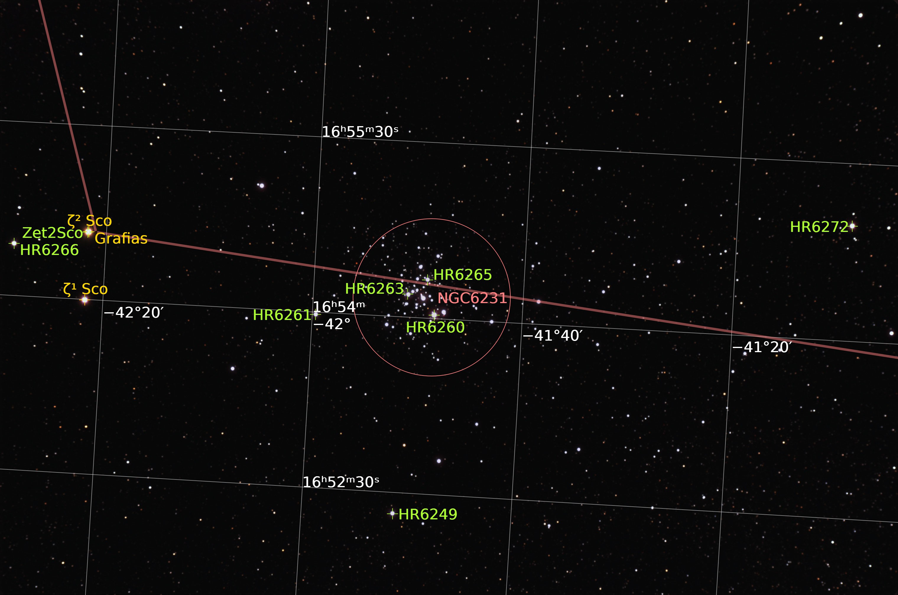 NGC 6231 (also known as Caldwell 76) is an open cluster of stars in the constellation of Scorpius. Distance from Earth is 5.9 kly. Size: 85.6 x 56.7 arcmin, Pixel scale: 1.69 arcsec/pixel