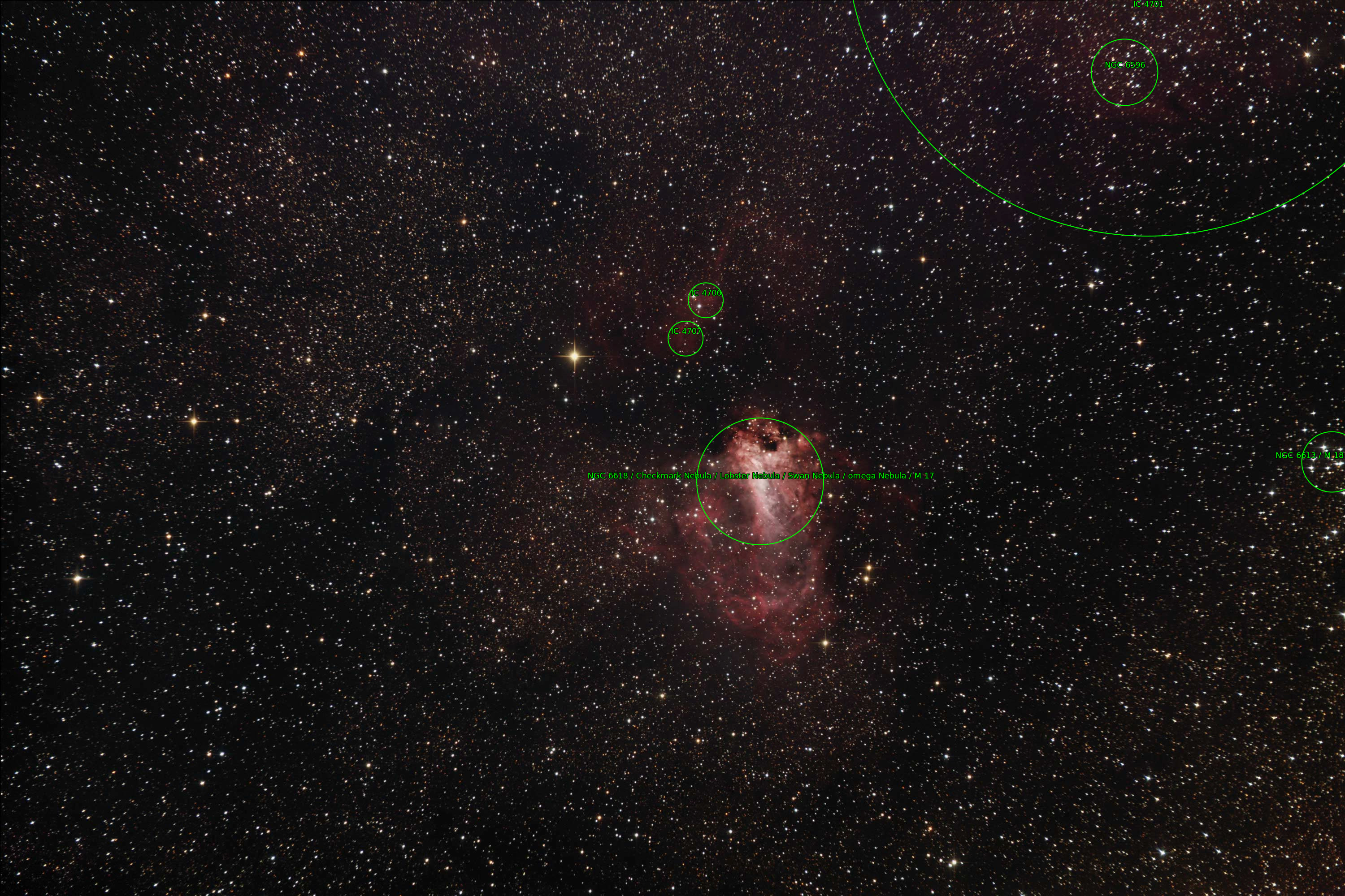 NGC6618 Messier 17 or the Omega Nebula is an H II region in the constellation Sagittarius about 5,000-6,000 light-years from Earth. Still some more work to do with collimation and spacing between the coma corrector and camera.