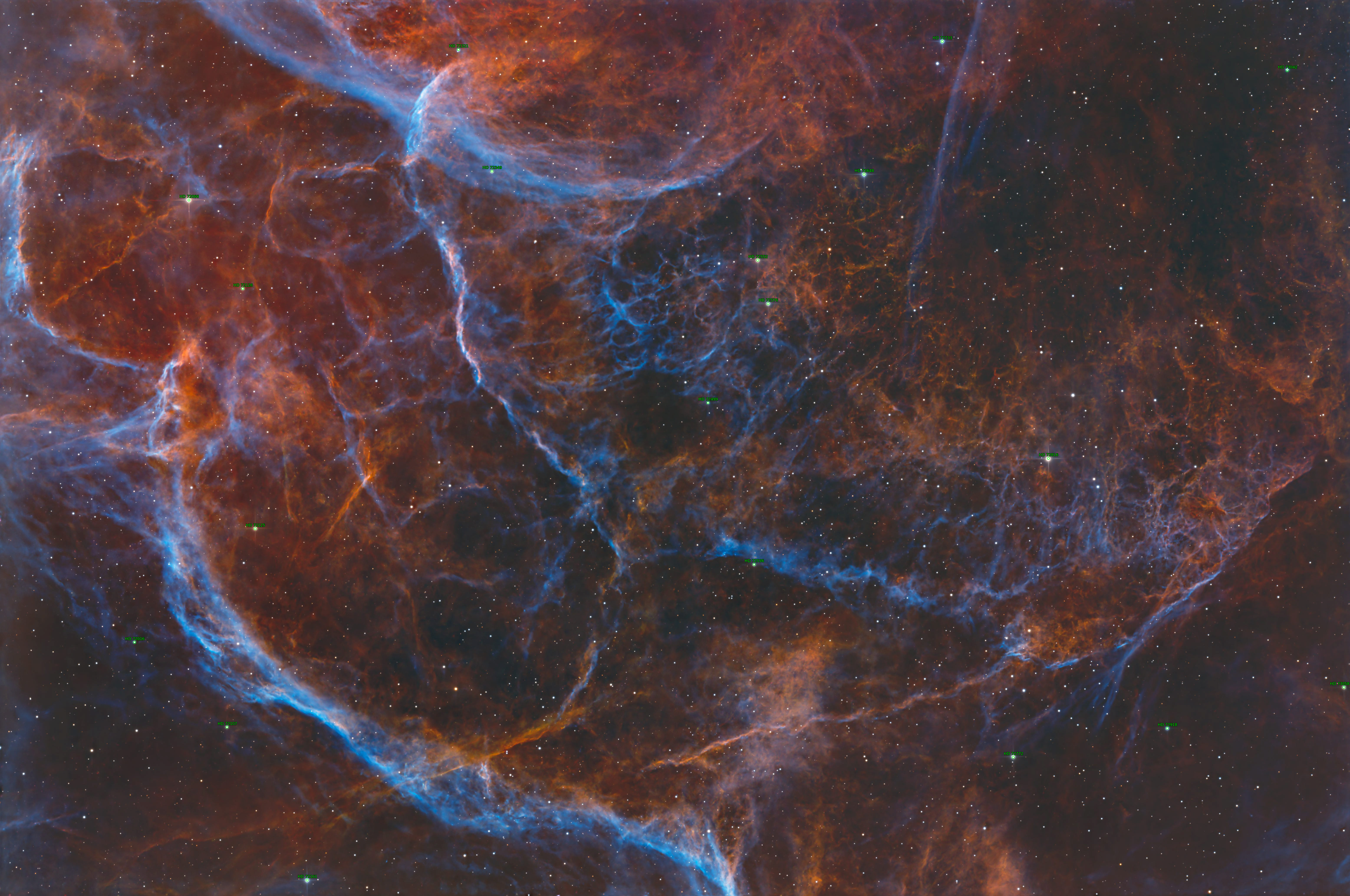 Small section of the Vela supernova remnant. It exploded approximately 11,000 years ago ad was about 900 light-years away. Processed in PixInsight with a Foraxx Palette. Center : RA 08h 31m 23.457s DEC -43° 41' 58.568", Size: 69.6 x 46.2 arcmin, Pixel scale: 0.671 arcsec/pixel