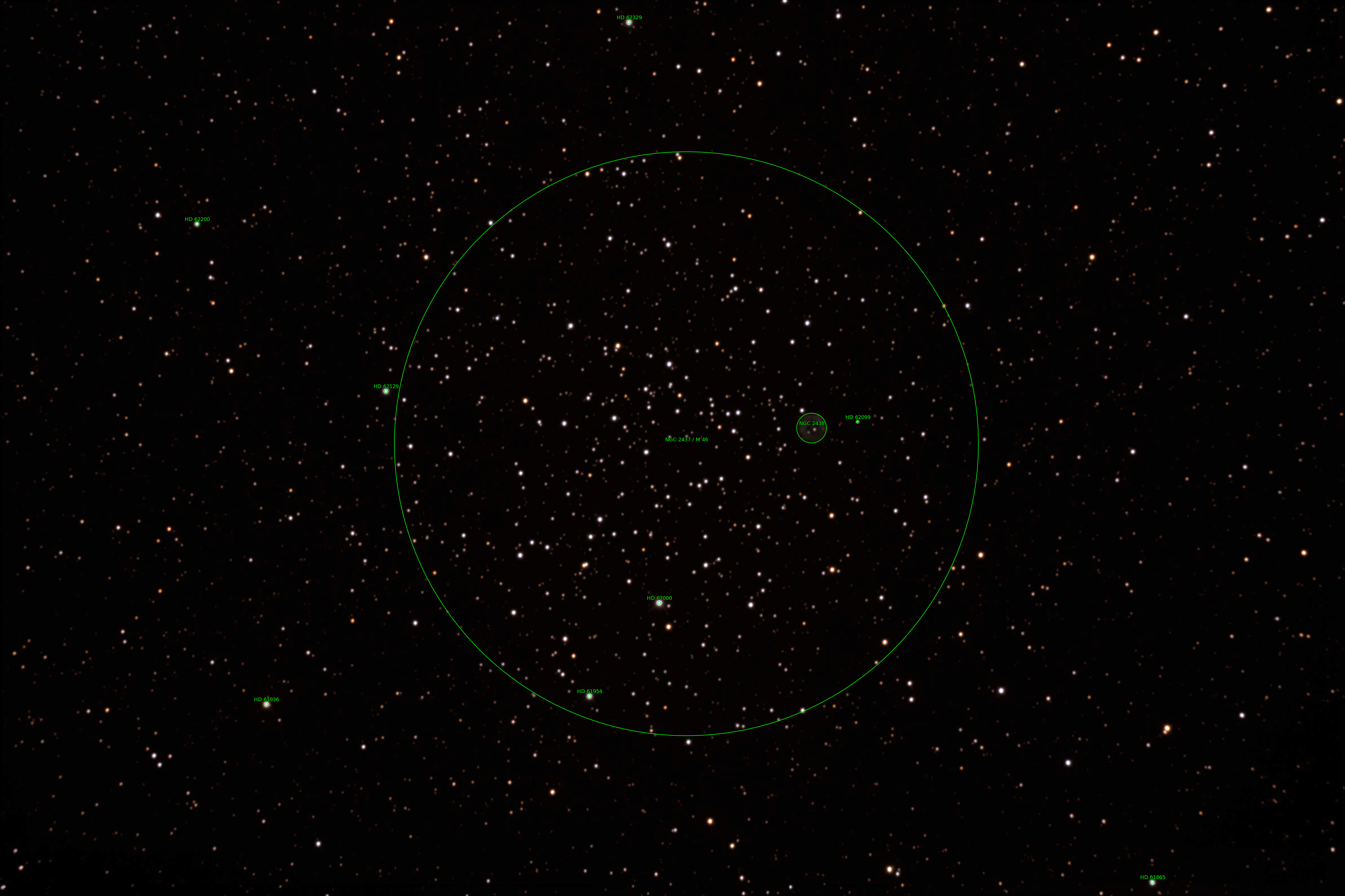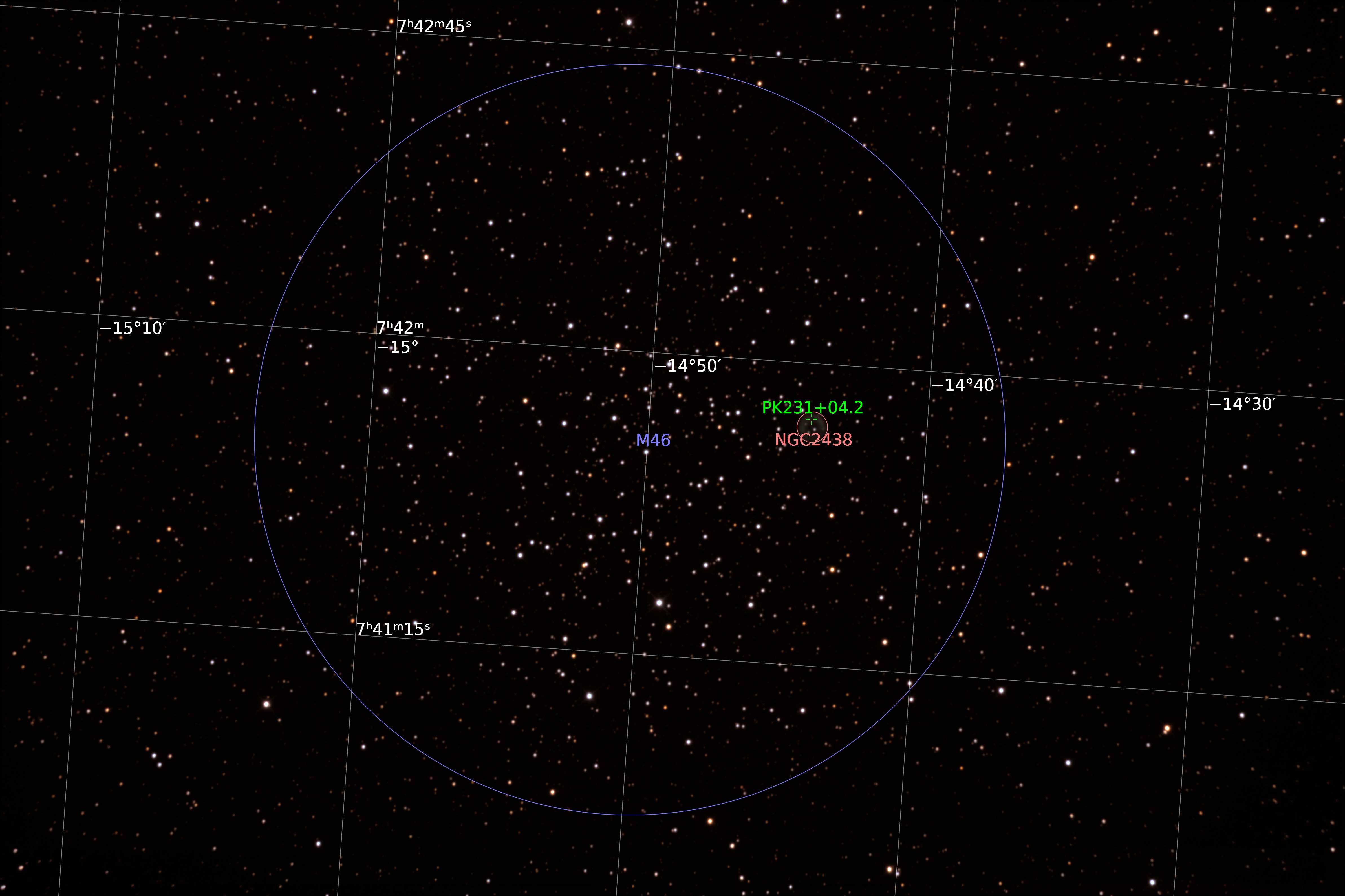 Messier 46 is an open cluster in the constellation Puppis. M46 is about 5,500 light-years away. The planetary nebula NGC 2438 can be seen towards the right of center in this image.