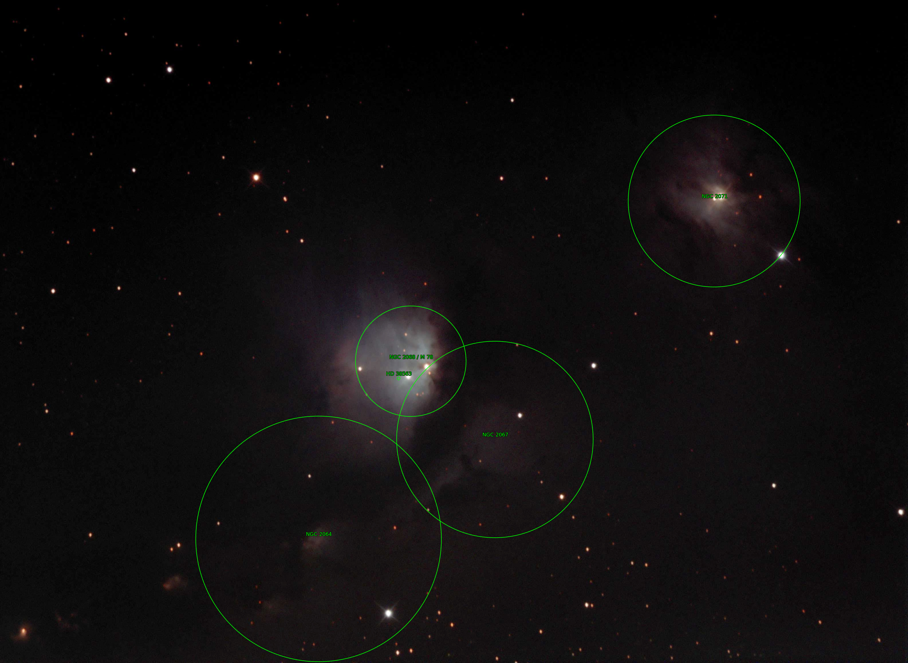 Messier 78 (also known as NGC 2068) is a reflection nebula in the constellation Orion about 1,600 light years from Earth. NGC 2071 can be seen to the top right, NGC 2064 to the lower left and NGC 2067 just beow and to the right of M78 which is the bright area in the center. Warm night (19.7C at 01:00) No moon, clouds came in at 1am. Image needs reprocessing.
