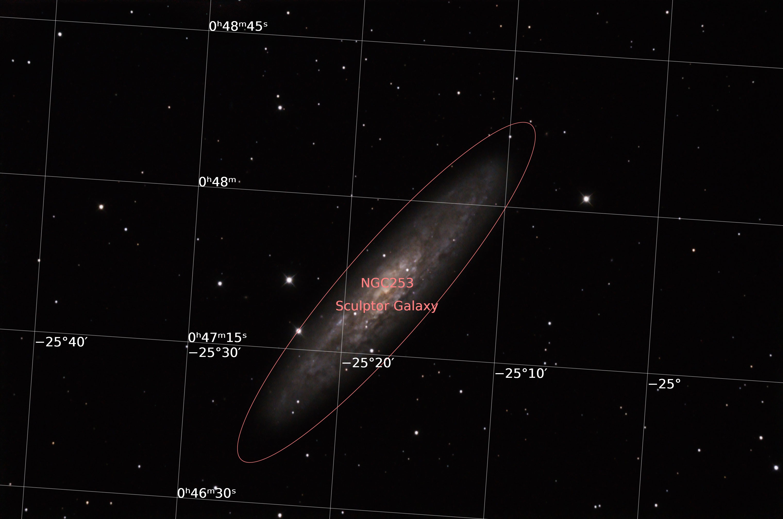 The Sculptor Galaxy (NGC 253) is an intermediate spiral galaxy in the constellation Sculptor. It is located about 11.4 million light years from Earth. Image was taken when the galaxy was almost directly overhead in the last hour before moonrise.