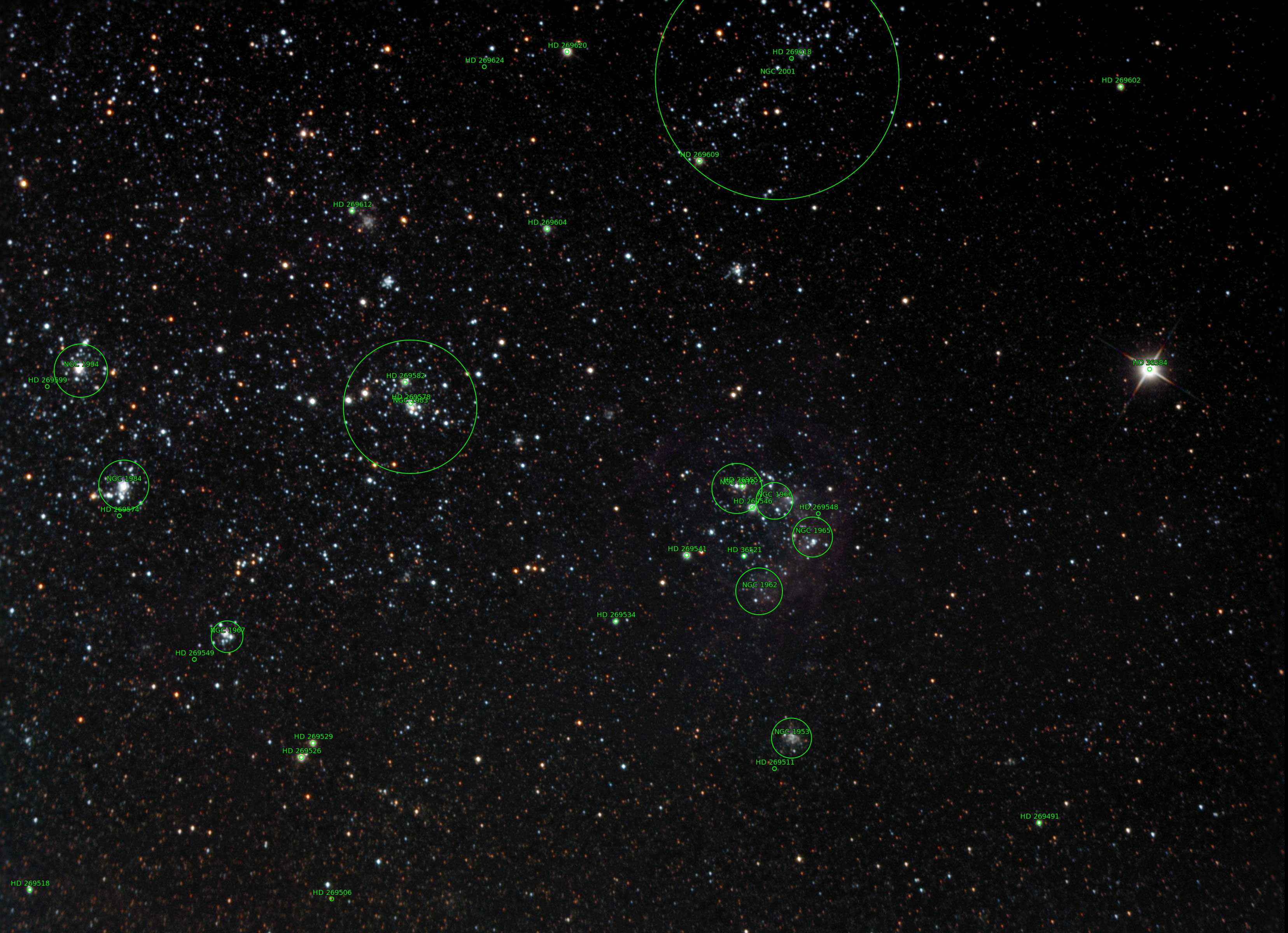 NGC 1970 is a cluster associated with nebulosity in Dorado. Also contains NGC 1966. Moon 85% waxing gibbous rise 17:35 set 02:21. Temp 22.5C at 22:23 18.6 at 00:23