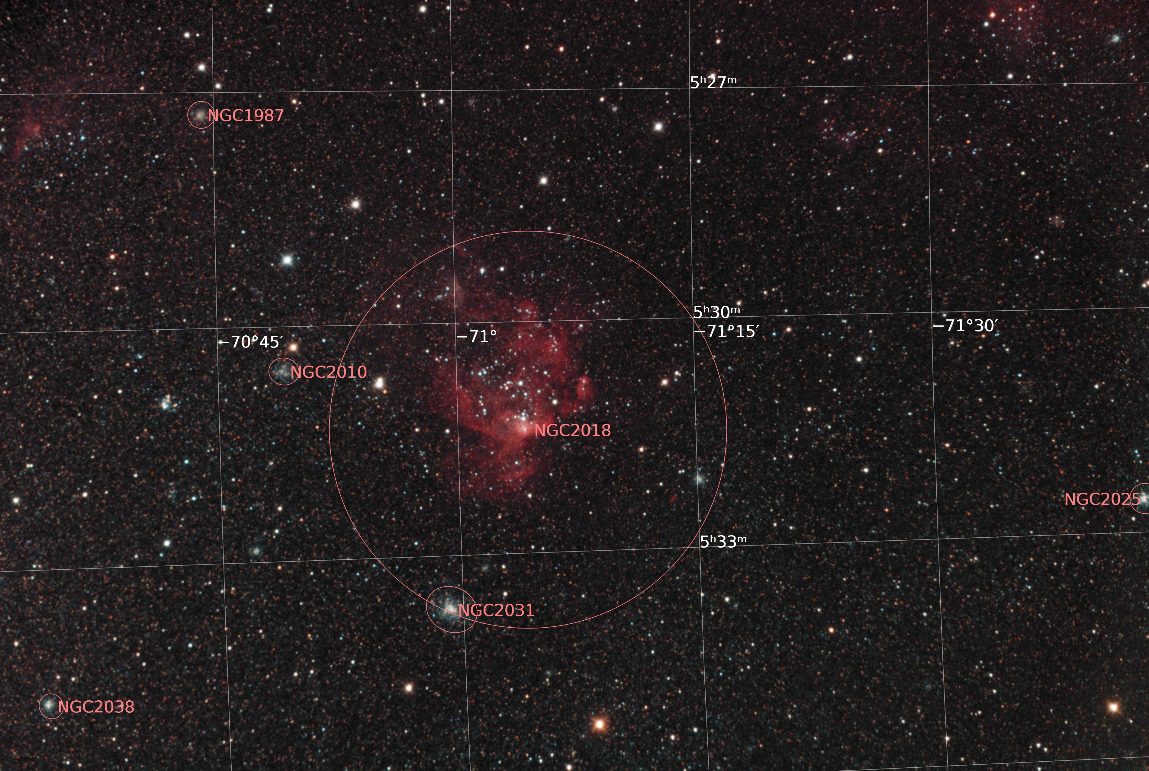 Henize 206, a star forming region, and open cluster NGC 2018 in the Large Magellanic Cloud. The smaller cluster below and slightly left of centre is NGC 2031. Taken over 3 nights. Distance is about 163,000 light-years. Field of view 72.20 x 48.48 arcminutes, 1.14 arcsec/pixel