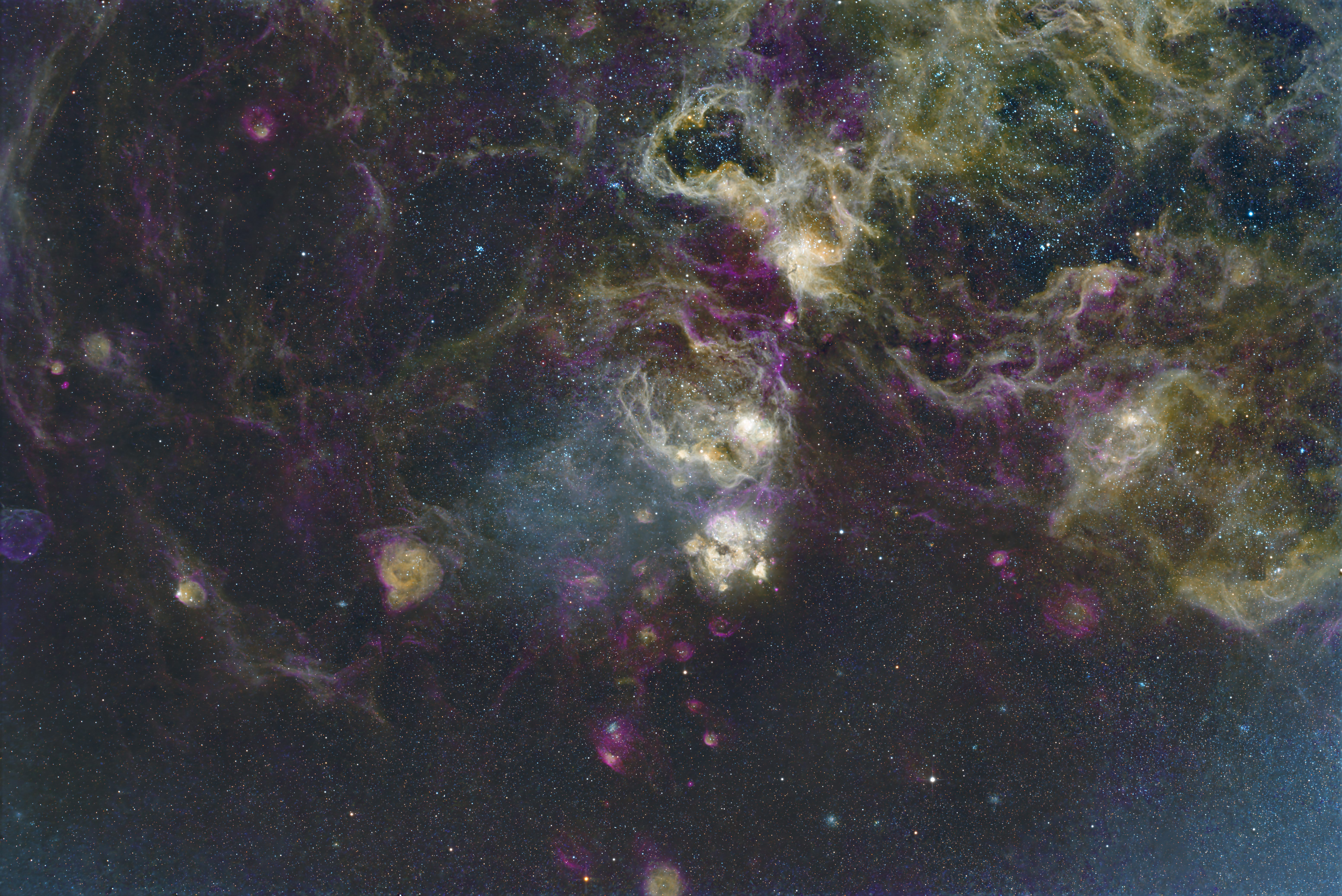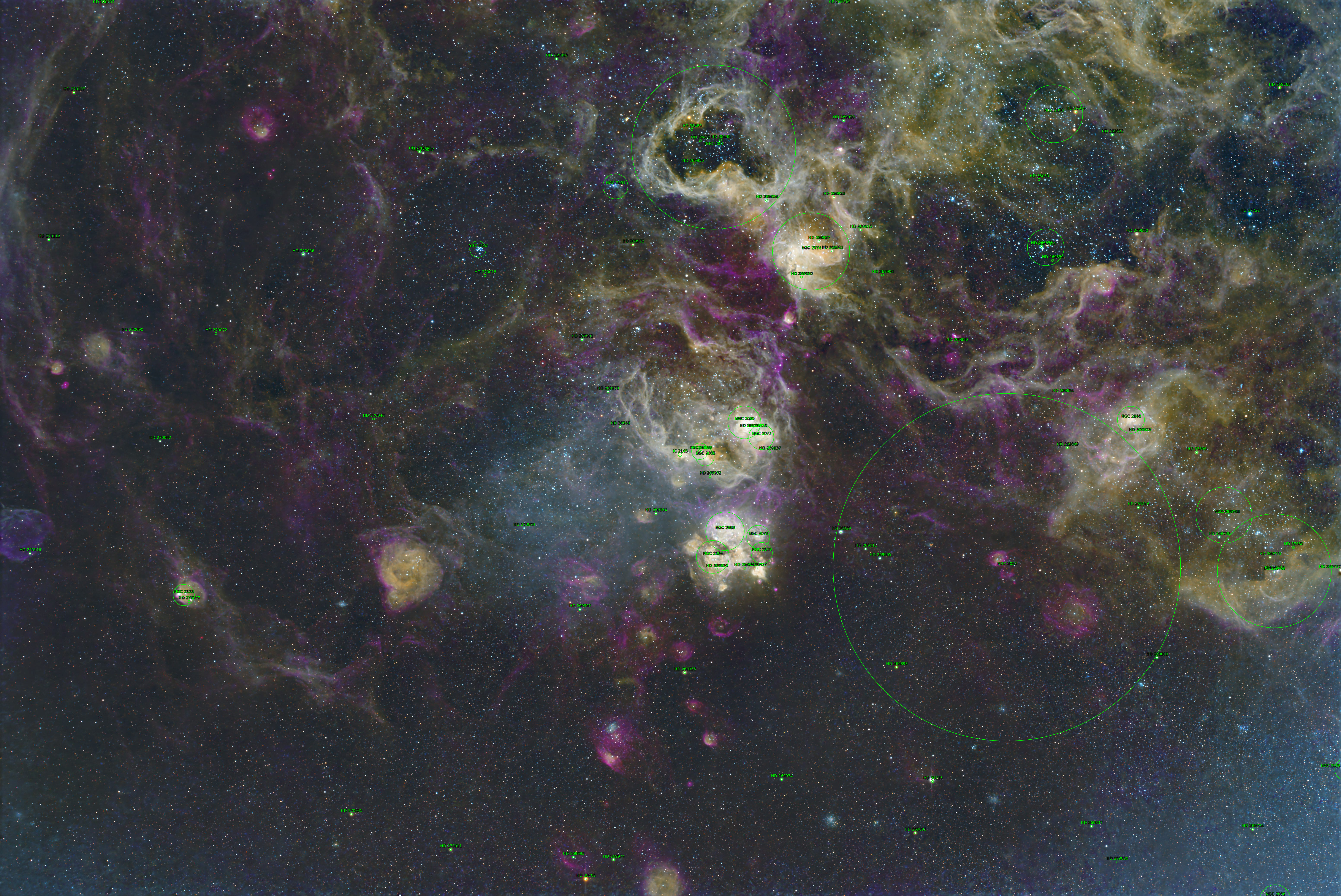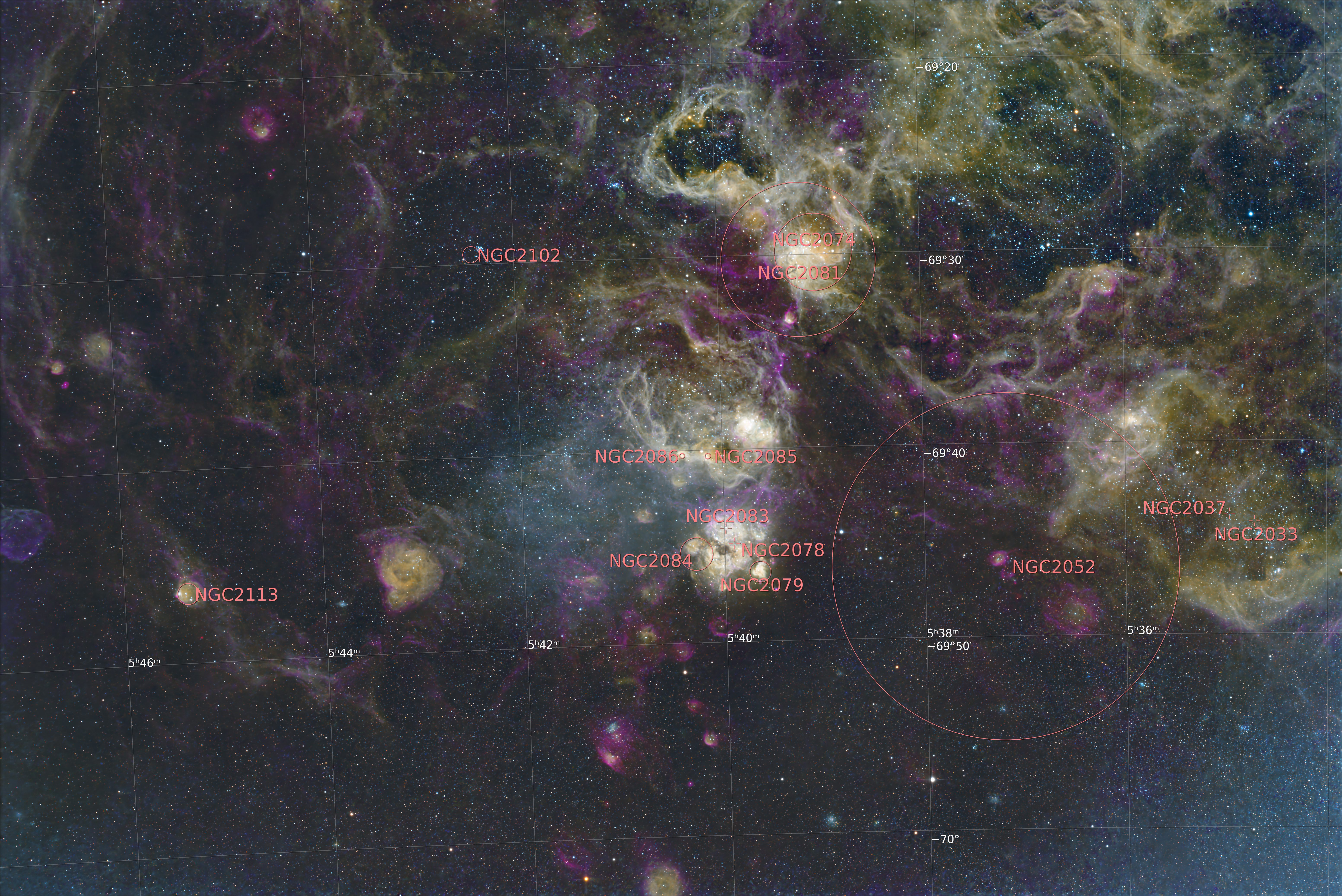 NGC 2080, also known as the Ghost Head Nebula, is a star-forming region and emission nebula close to the Tarantula nebula, in the constellation Dorado. It belongs to the Large Magellanic Cloud. Also contains IC 2145, NGC 2052, NGC 2033, NGC 2074, NGC 2081, NGC 2050. First image after a long break.