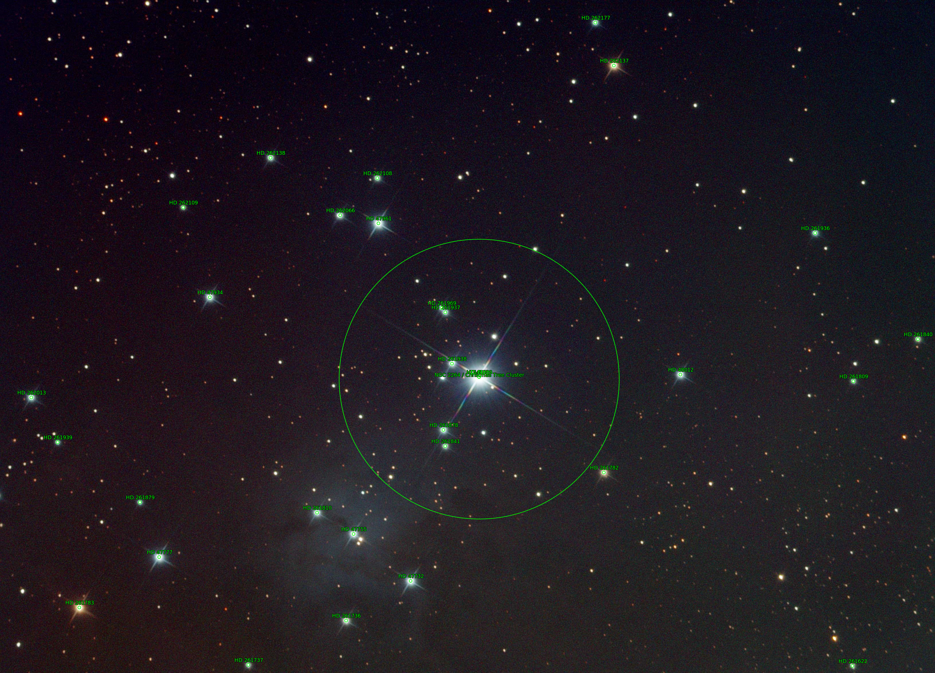 NGC 2264 Christmas Tree Cluster & Cone Nebula is located in the Monoceros constellation approximately 2600 light-years from Earth. The bright star is 15Mon.