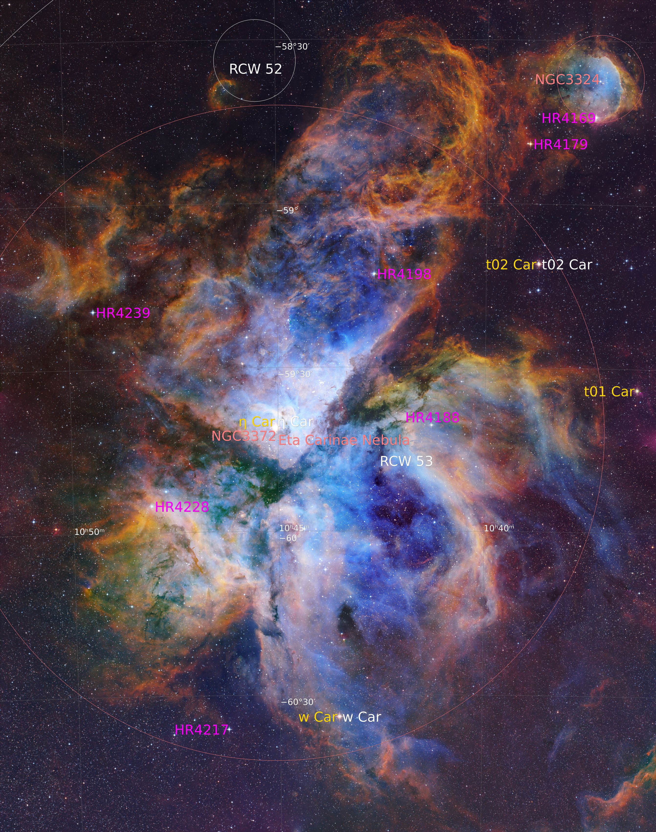 NGC 3372 or The Eta Carinae Nebula is an emission nebula in the constellation Carina. It is located about about 7500 ly from Earth. This is an 8 panel mosaic with a field of view about 2 x 2.5 degrees.