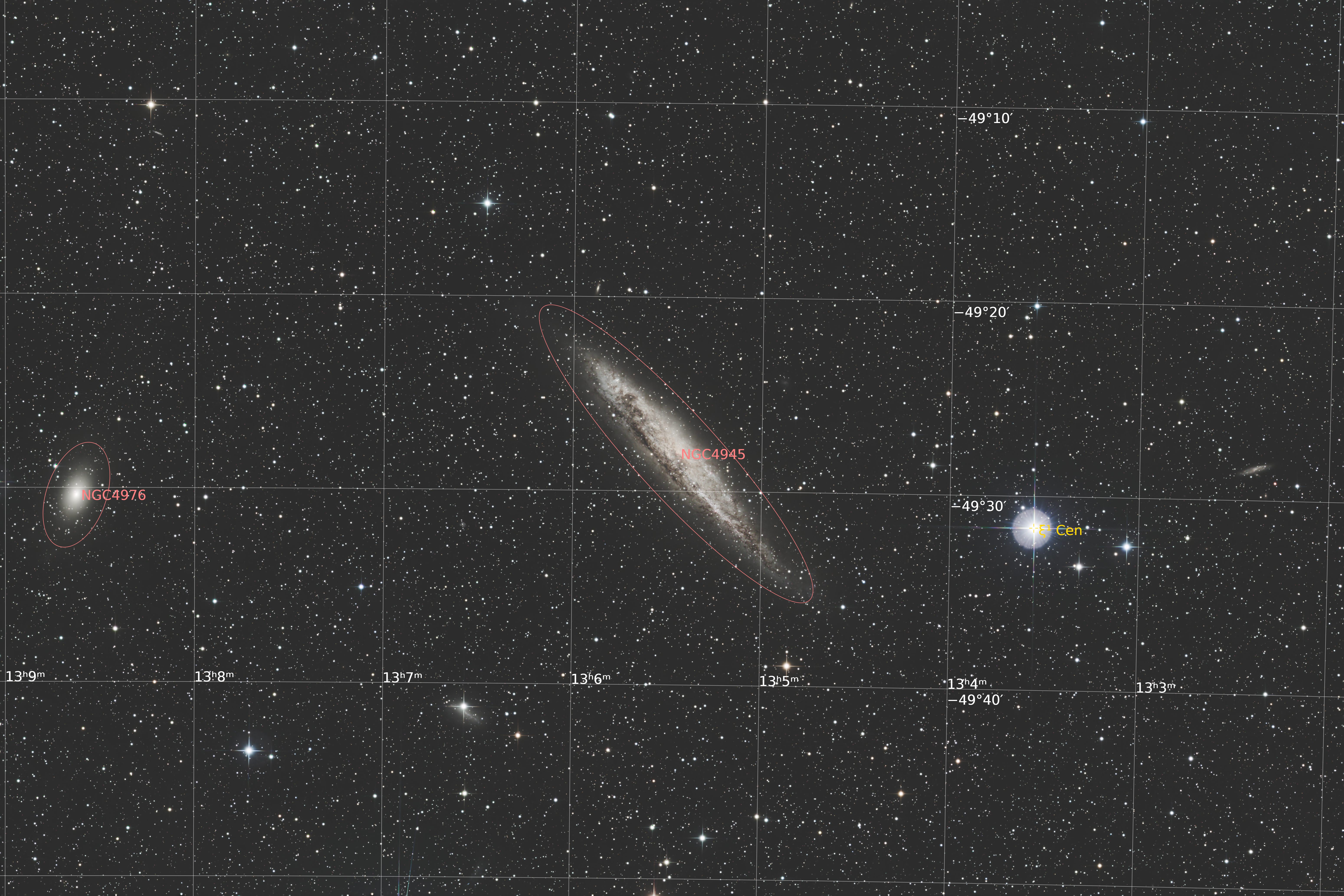 NGC 4945 is a dusty, edge-on spiral galaxy in the constellation Centaurus. Distance is approx 11.7 million light years. Other galaxies that can been seen are NGC 4976 (35 million LY) and NGC 4945A.