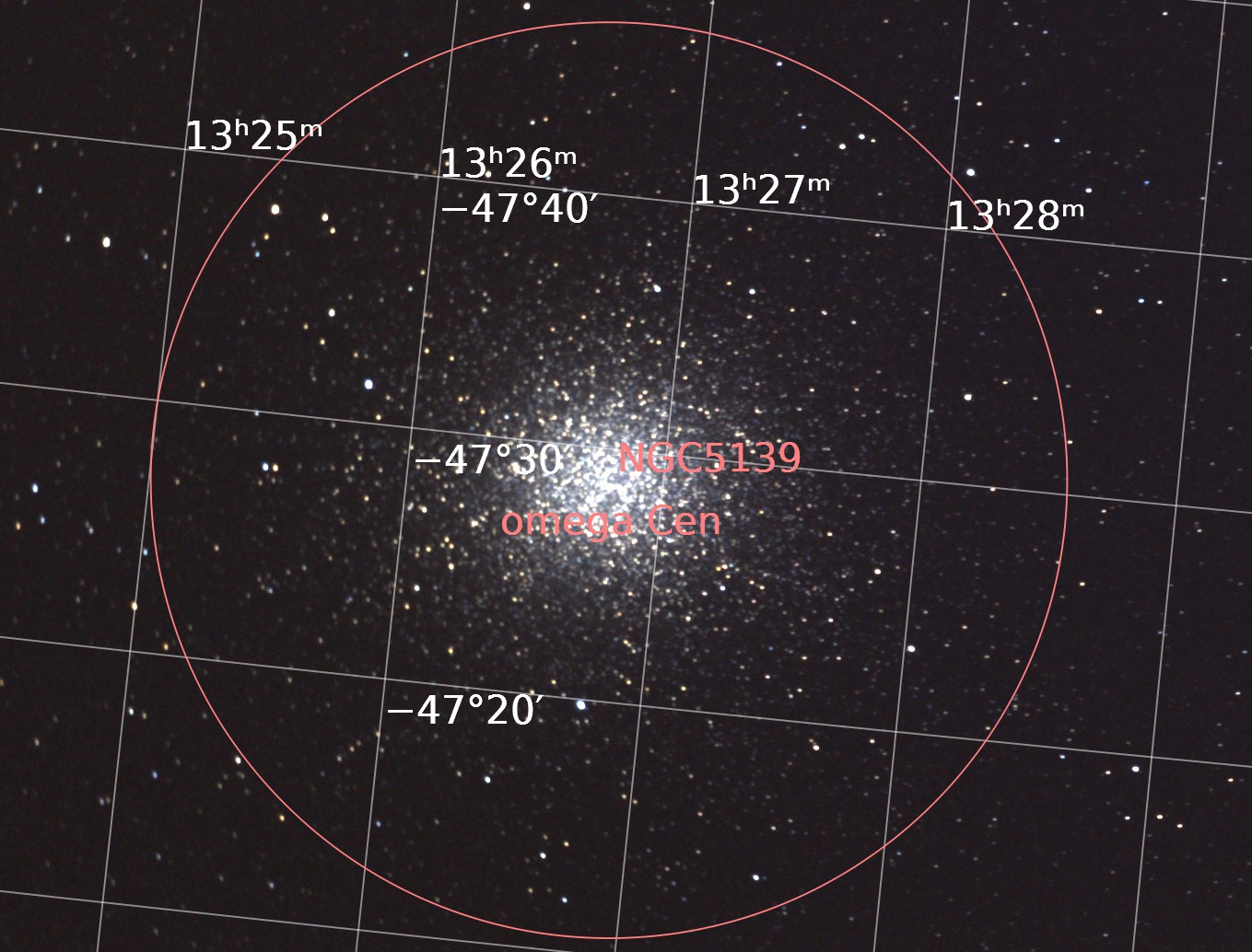 NGC5139 or Omega Centauri is a globular cluster in the constellation of Centaurus, at a distance of 15.8 kly from Earth. This is a test image with no guiding. I'm not happy with the shape of the stars at the edges of the image. Size: 49.6 x 37.7 arcmin, Pixel scale: 2.19 arcsec/pixel