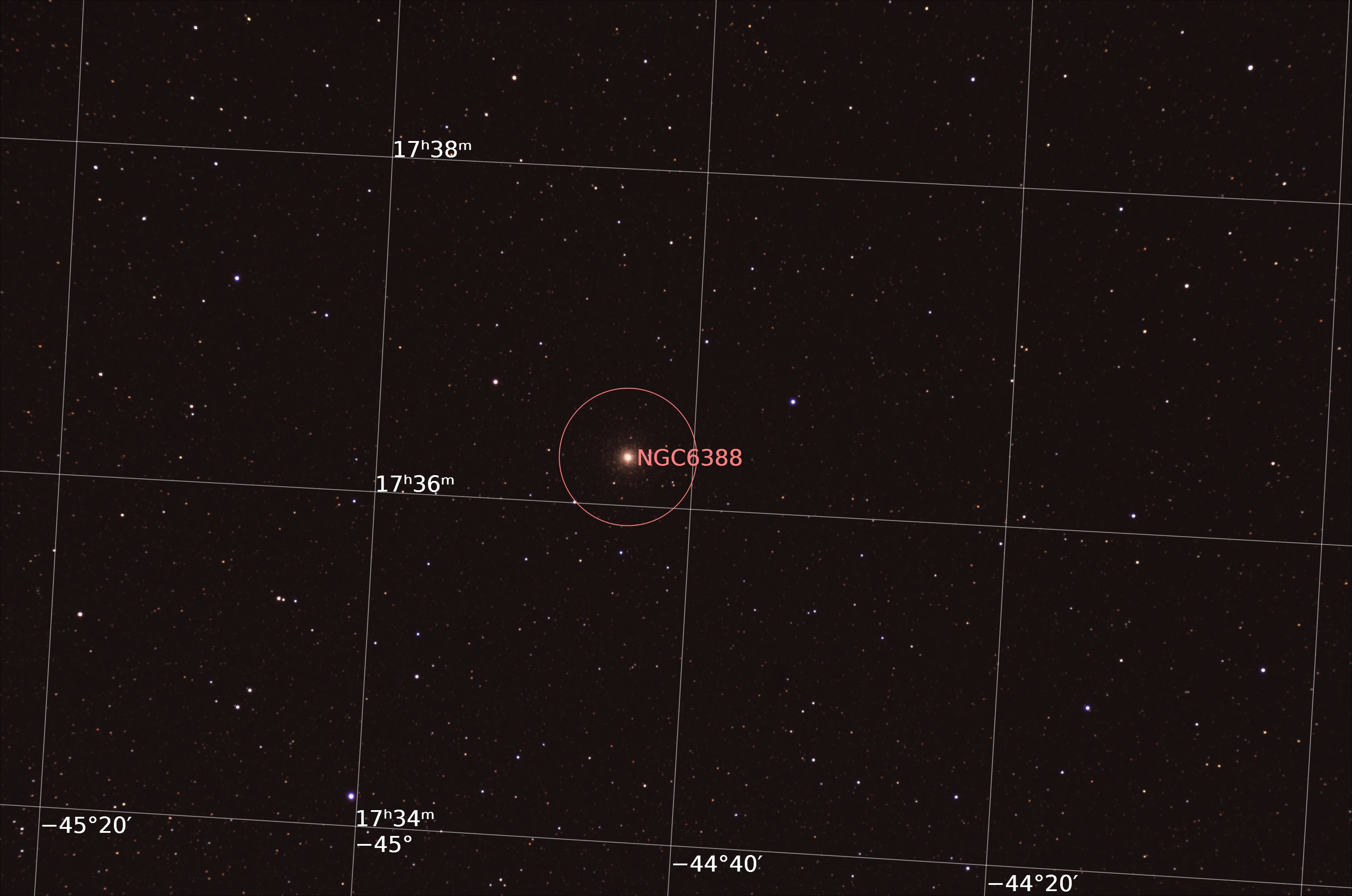 NGC6388 is a Globular Cluster in Scorpius. Distance from Sun: 32.6 kly. Size: 85.6 x 56.7 arcmin, Pixel scale: 1.69 arcsec/pixel