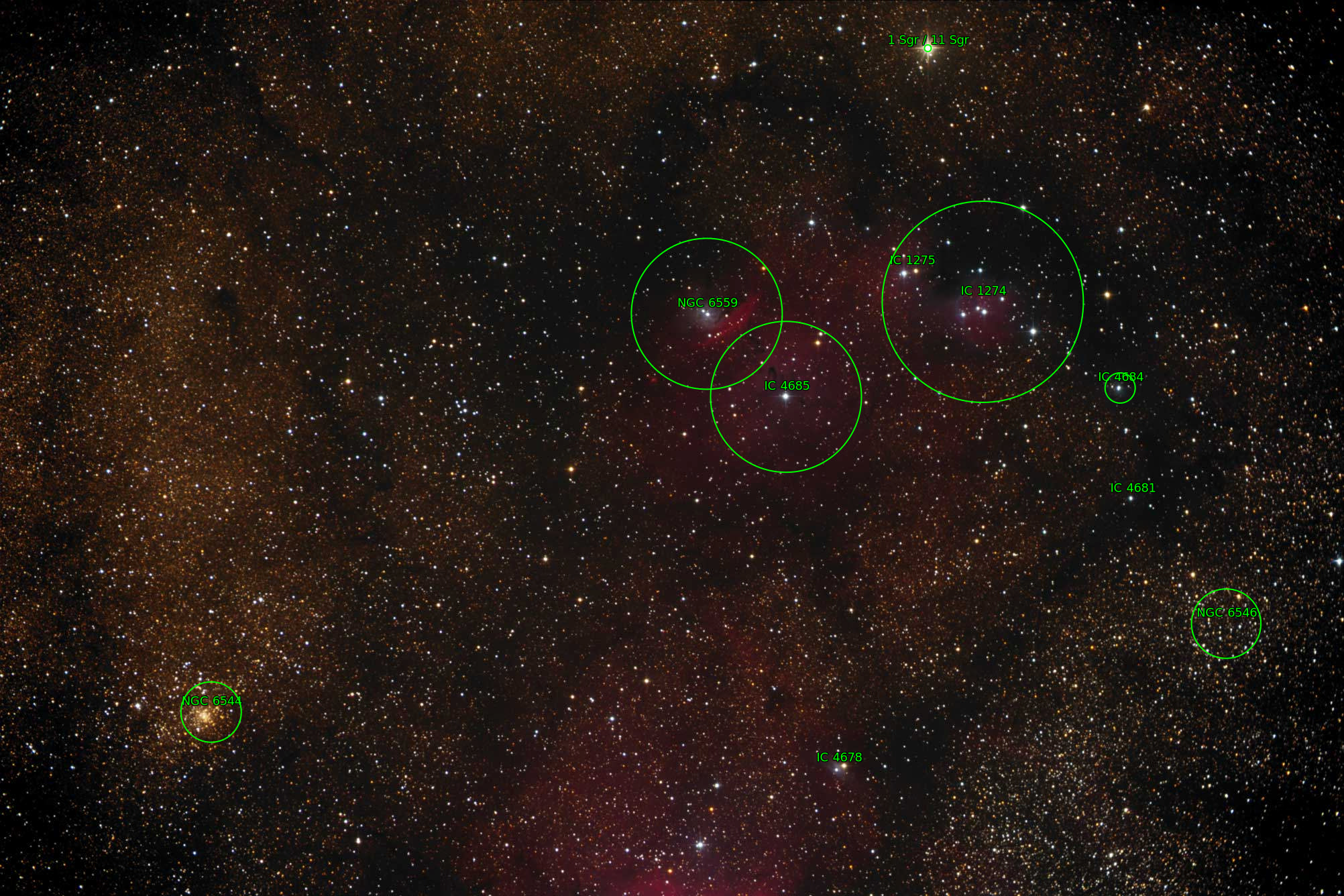 Located in Sagittarius. Image features the Reflection Nebulae NGC 6559 just above center and IC1274 & IC1275 to the right. Globular cluster NGC 6544 can be seen in the lower left. M8 is just out of view at the bottom.