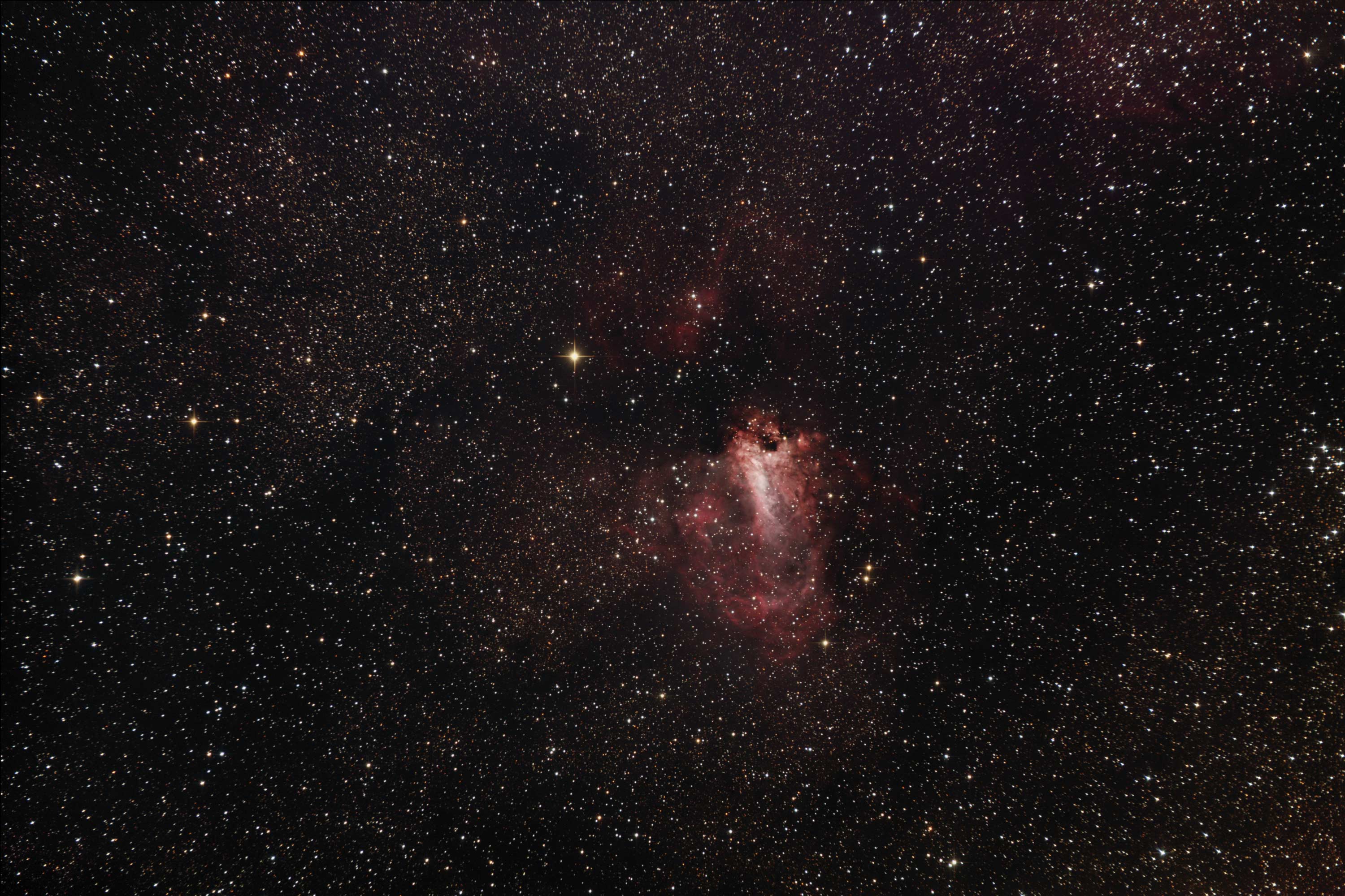 NGC6618 Messier 17 or the Omega Nebula is an H II region in the constellation Sagittarius about 5,000-6,000 light-years from Earth. Still some more work to do with collimation and spacing between the coma corrector and camera.