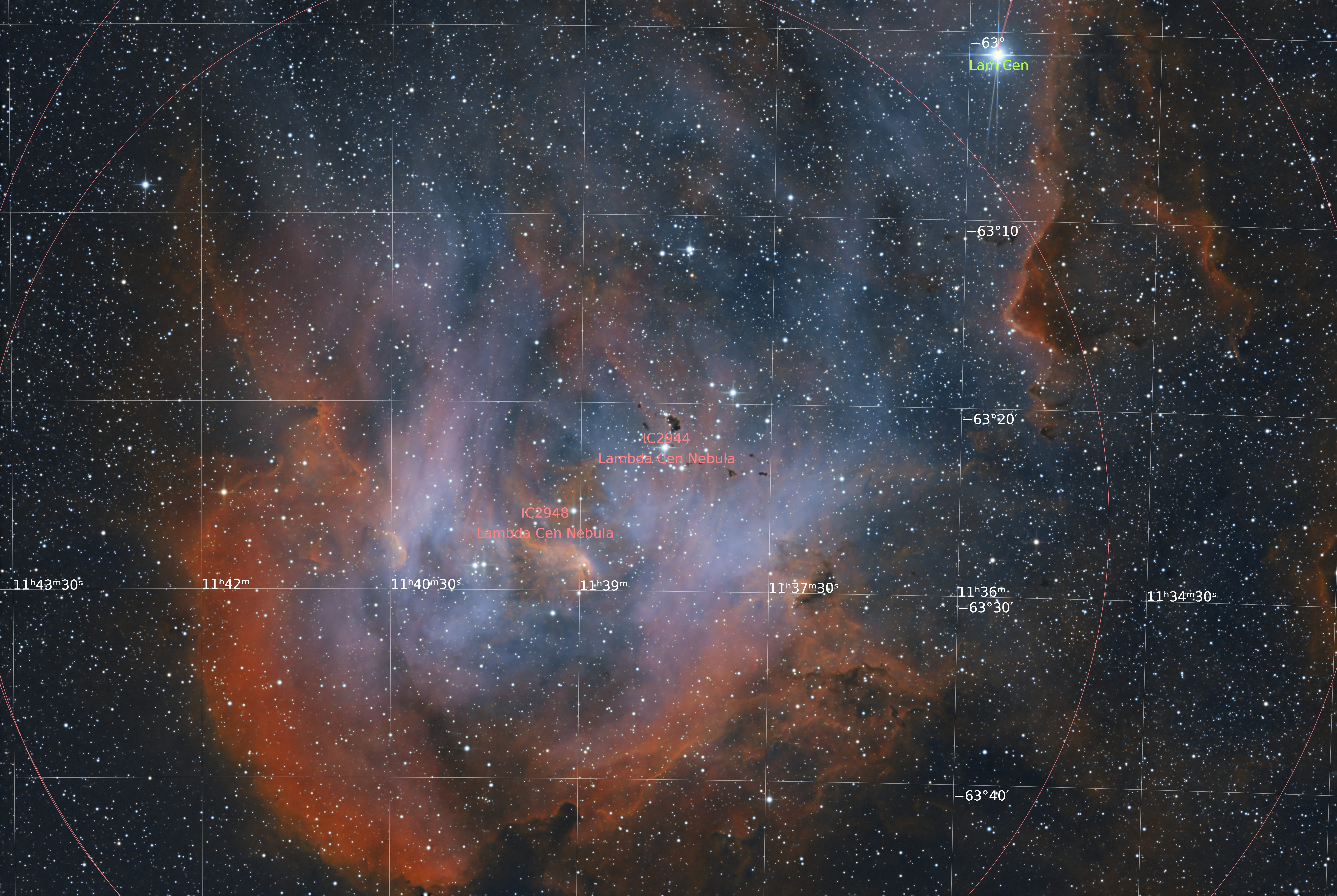 This is the body part of the Running Chicken Nebula, also known as IC 2944, RCW 62 and Gum 42. Lambda Centaurus is the bright star in the upper right of the image.