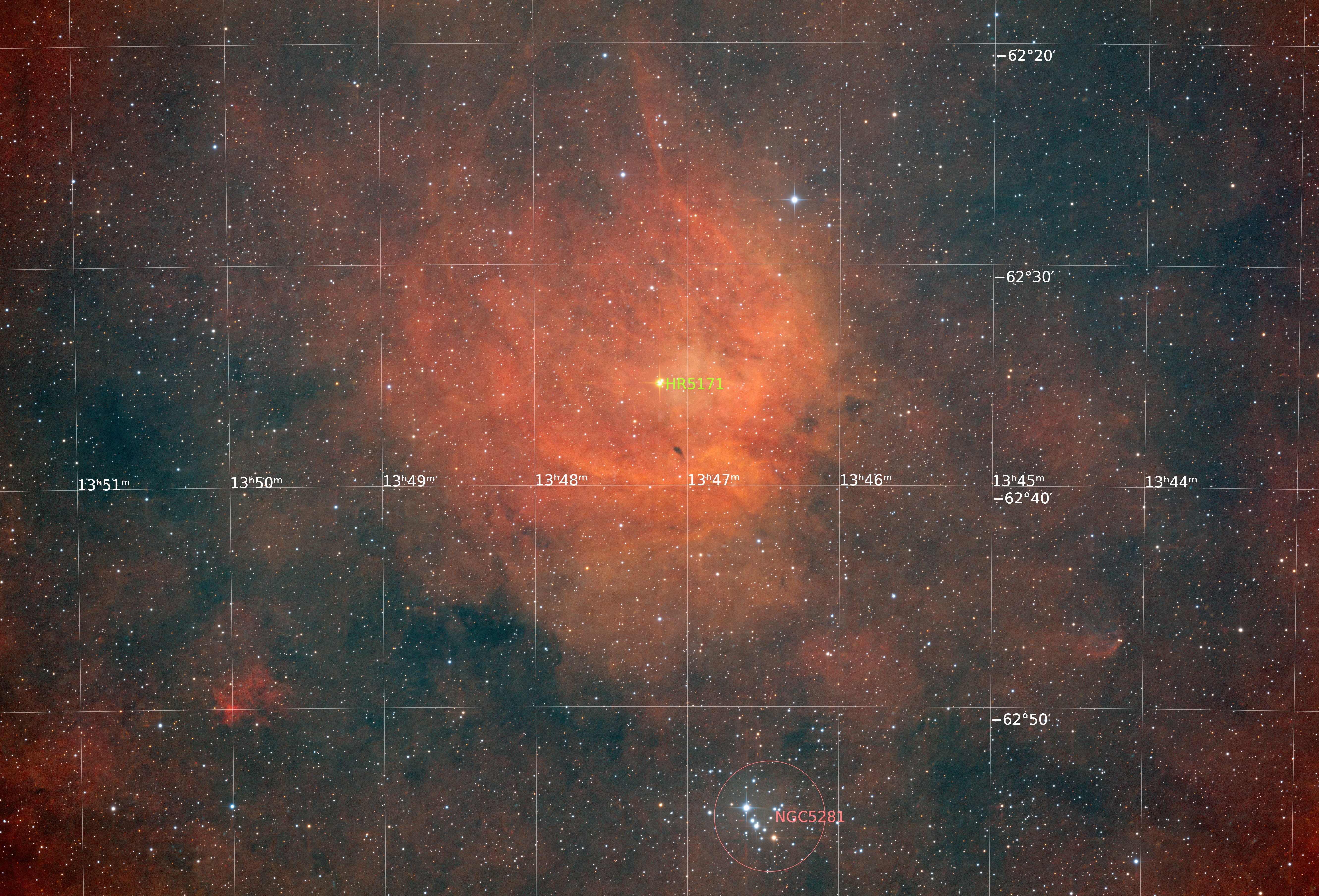 RCW 80 (Gum 48d) is an HII region ionised by the supergiant star HR 5171B. The cluster of four bright stars in a line at the bottom is NGC 5281 - the Little Scorpion Cluster.