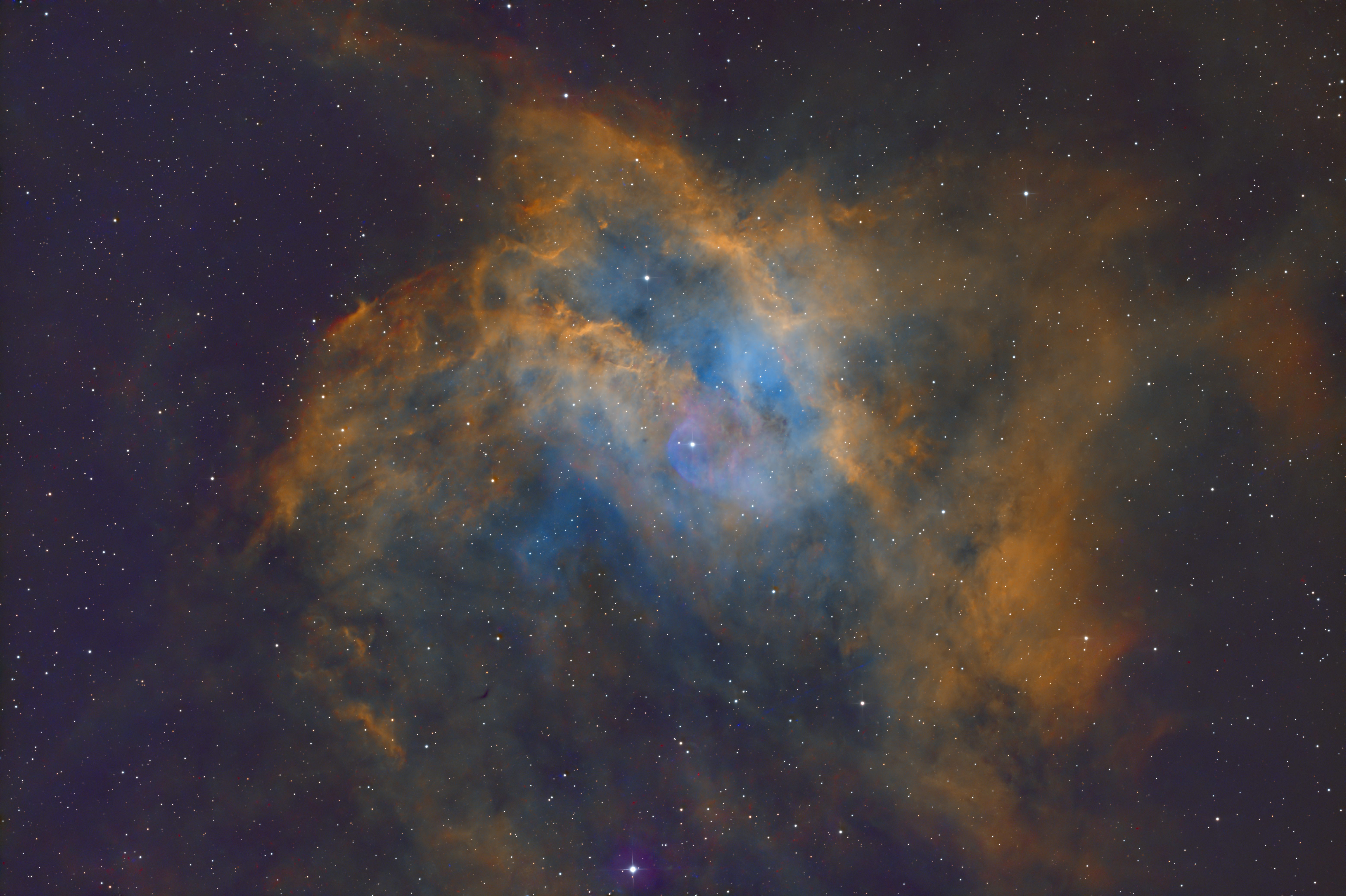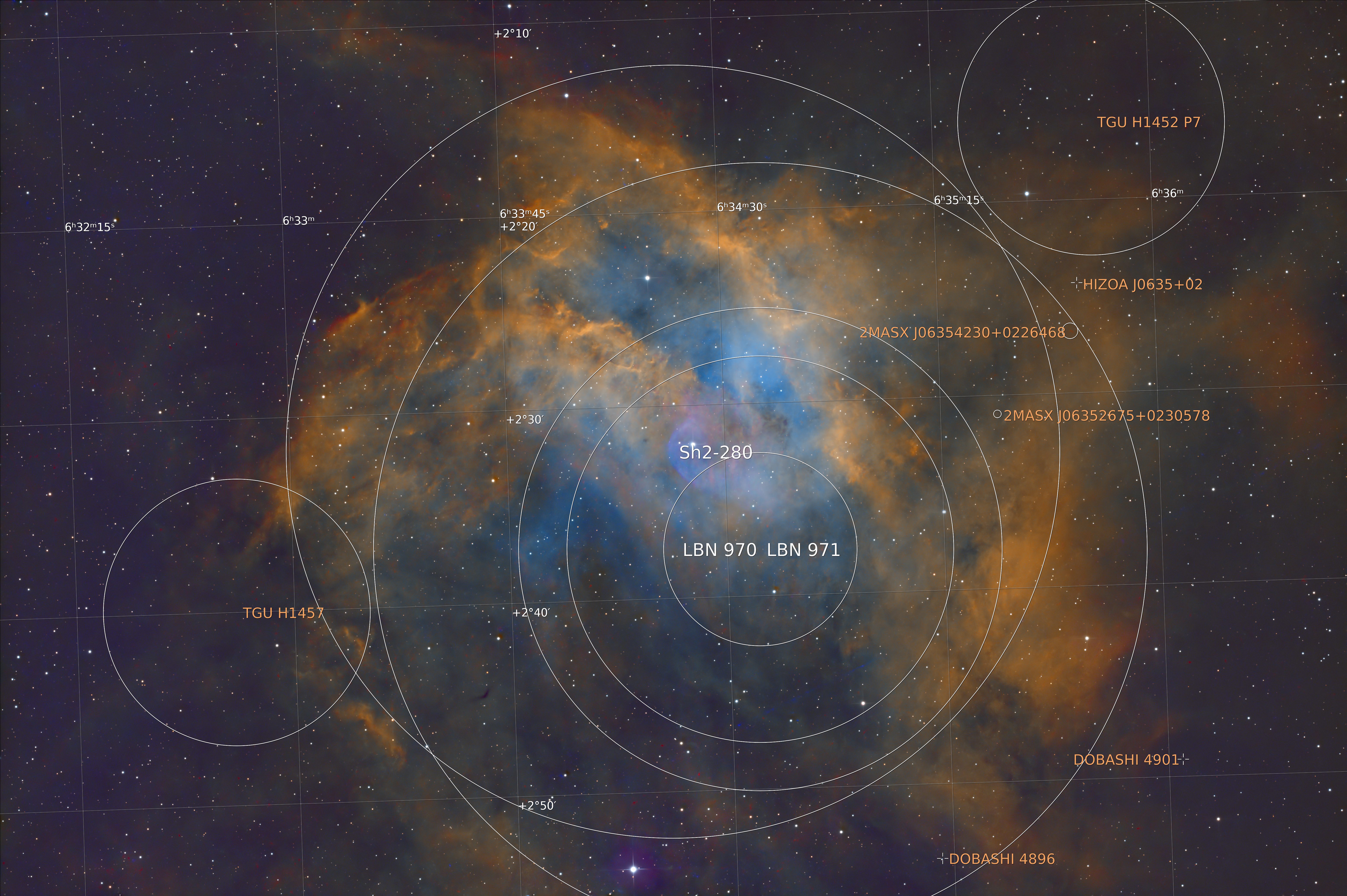 Sh2 280 is a rarely imaged faint emission nebula situated around 5500 light years away. It's located very close to the Rosette Nebula. Processed as SHO.